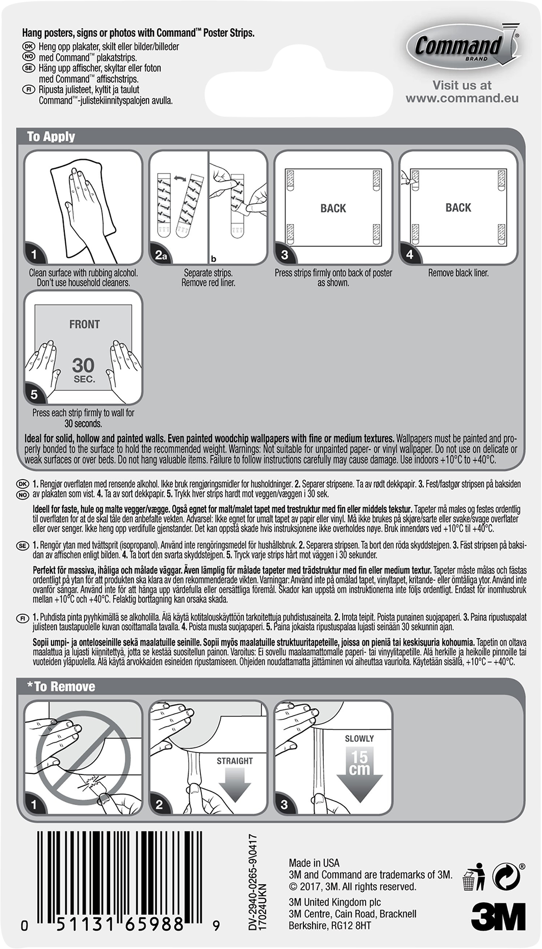 Command pósterr Strips es una solución rápida y conveniente para colgar de forma segura pósters, calendarios y otros objetos ligeros. Las tiras se adhieren fácilmente a la pared y se pueden utilizar en la mayoría de las superficies lisas, como paredes pintadas, papel tapiz pintado, azulejos, metal y madera. No deben utilizarse en papel tapiz sin pintar, papel pintado de vinilo o superficies delicadas.