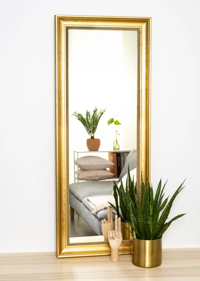 ¿Sabías que también se pueden colocar espejos más grandes en el suelo, apoyados directamente contra la pared? Es perfecto para aquellos que no pueden o no quieren perforar sus paredes. ¡Además, da una expresión hermosa, libre y bohemia! Si elige esta solución, es bueno asegurarse de que el espejo se mantenga realmente estable en la superficie del suelo.