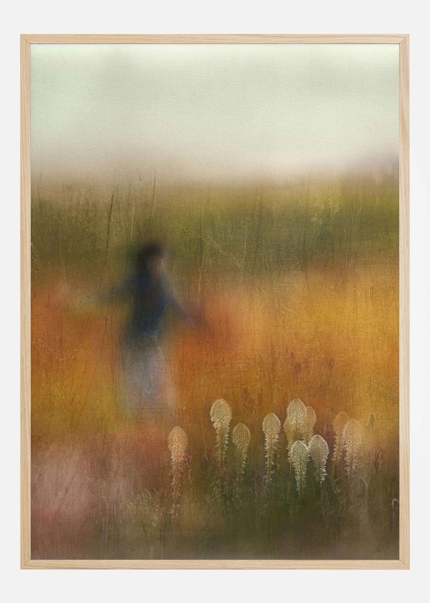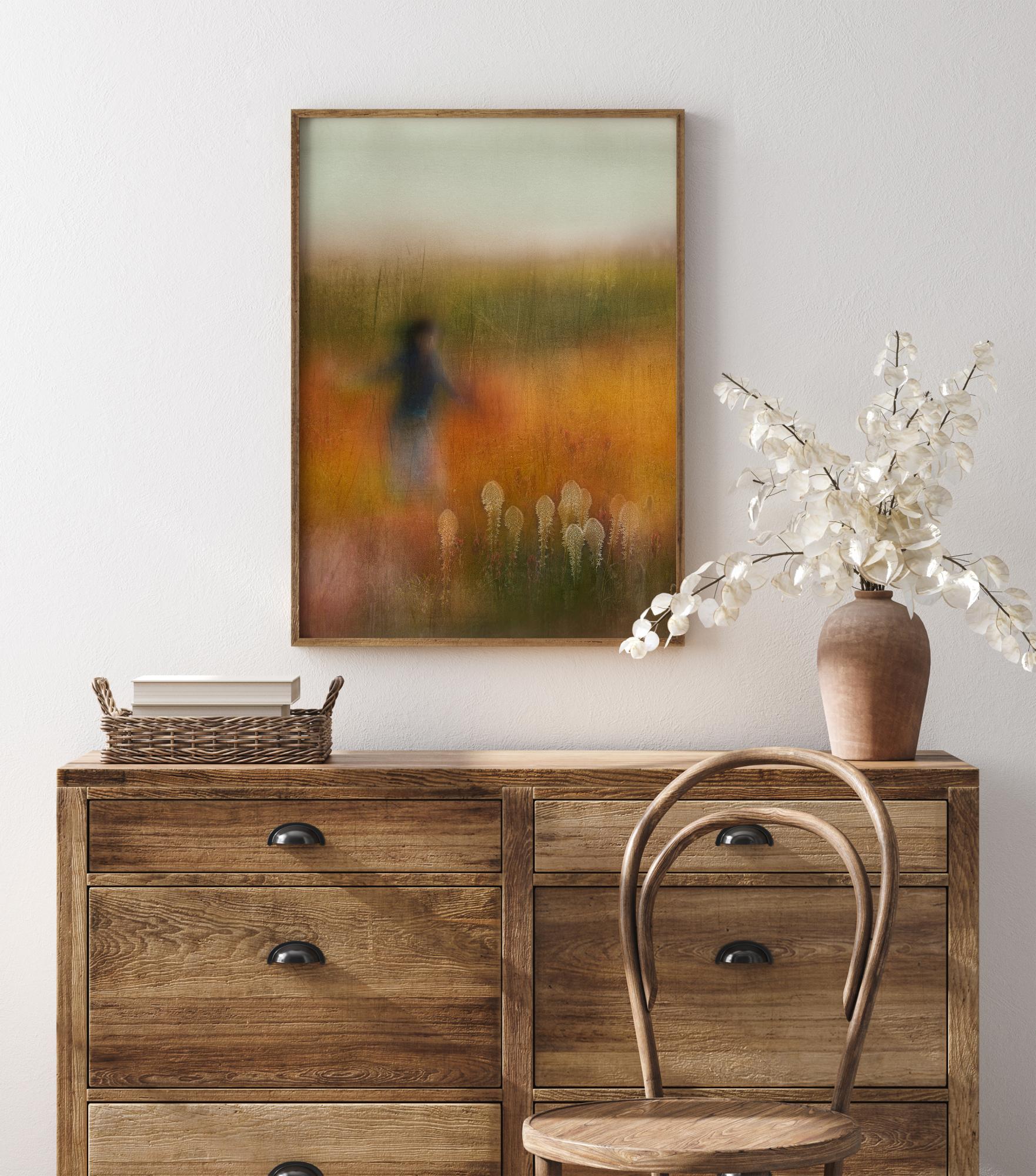 Un póster abstracto con una niña en hierba larga de oso. La imagen parece una pintura suave con colores amarillos y verdes que evocan una sensación de primavera. La niña borrosa se mueve a través de los fuertes trazos de pincel en la hierba para crear movimiento en toda la imagen. Cuelga esto en tu hogar para tener un fantástico punto de partida para conversaciones.