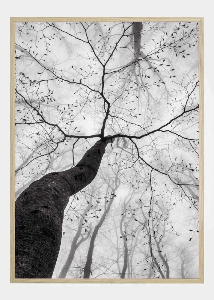 Un póster de naturaleza con un tronco de árbol que se extiende hacia el cielo. Deja que tu mirada se desplace hacia arriba a lo largo del tronco hasta las ramas que se extienden hacia el cielo. Los árboles con un enfoque suave llenan el fondo con sus hojas. Esta imagen en blanco y negro es una gran adición a tu pared que te permite sentir la tranquilidad de la naturaleza.