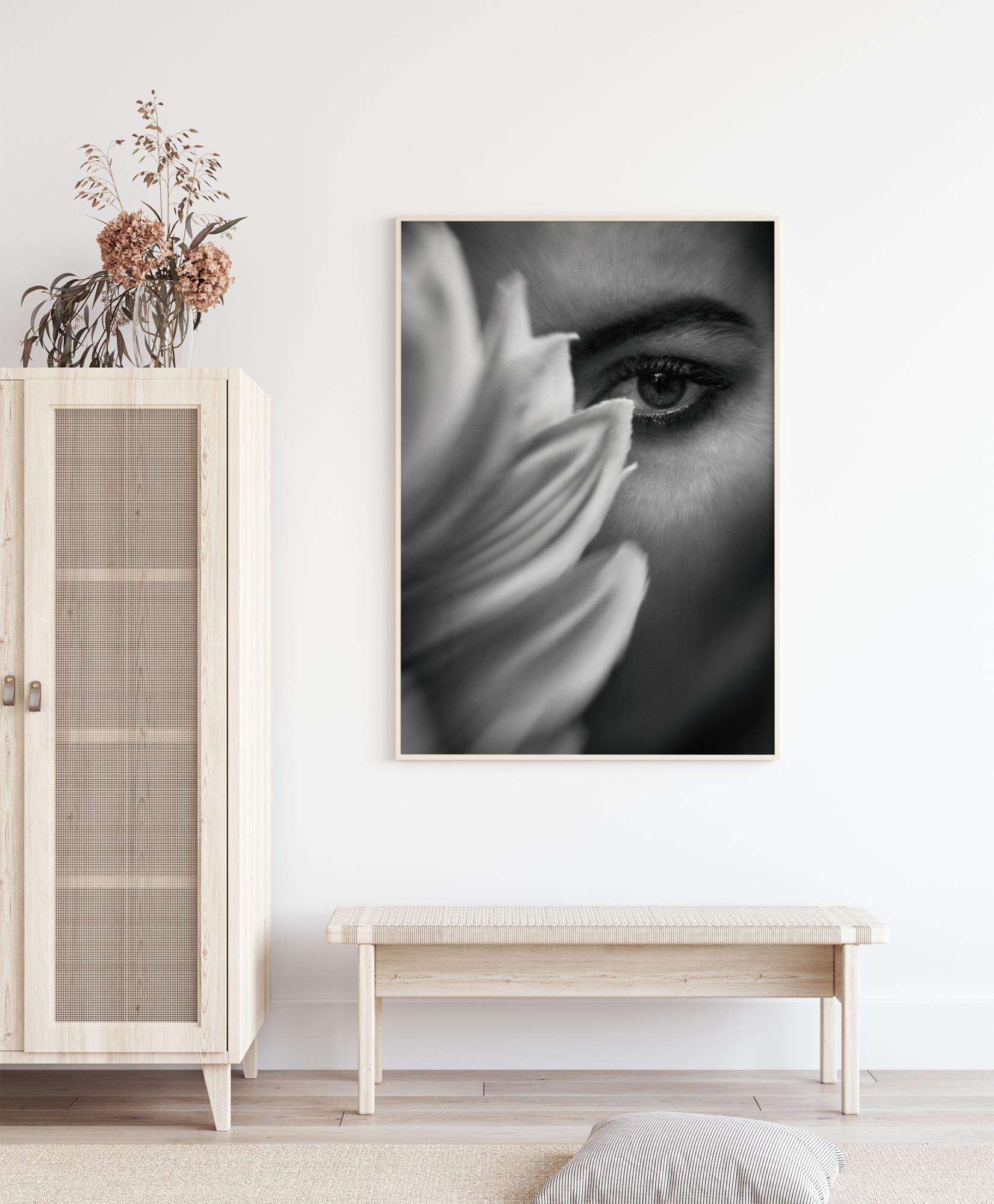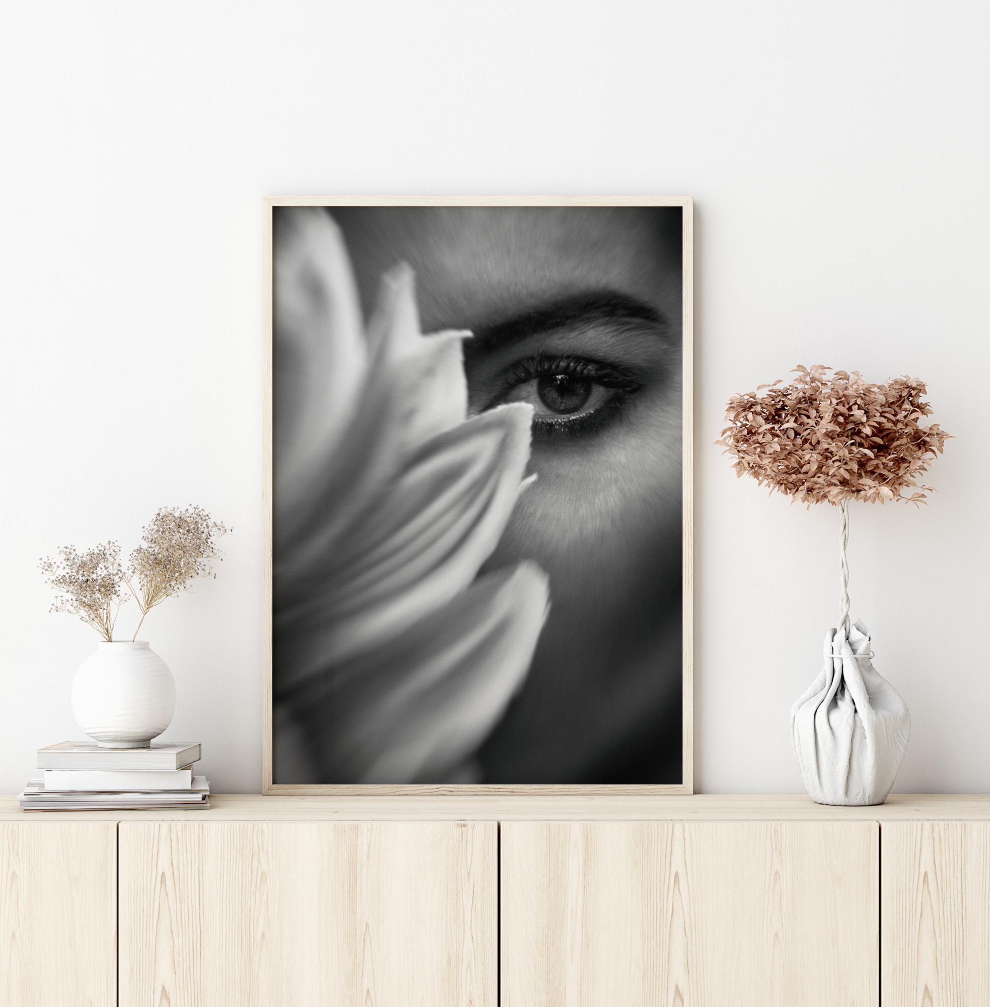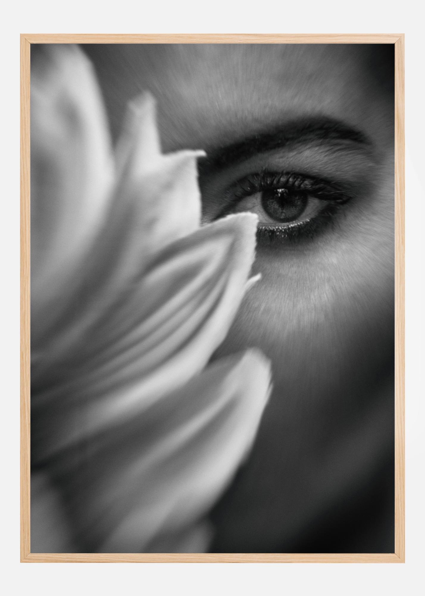 Un fantástico póster con una flor y un ojo de mujer en primer plano. Los suaves tonos en blanco y negro hacen que resalte entre todos los colores. Transforma cualquier habitación en un lugar tranquilo para la contemplación espiritual.