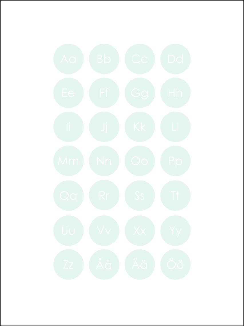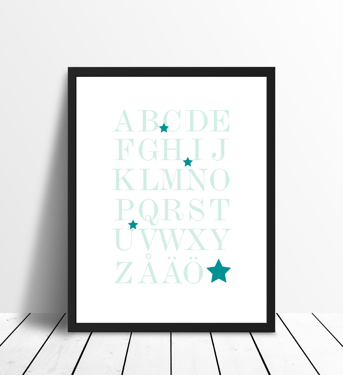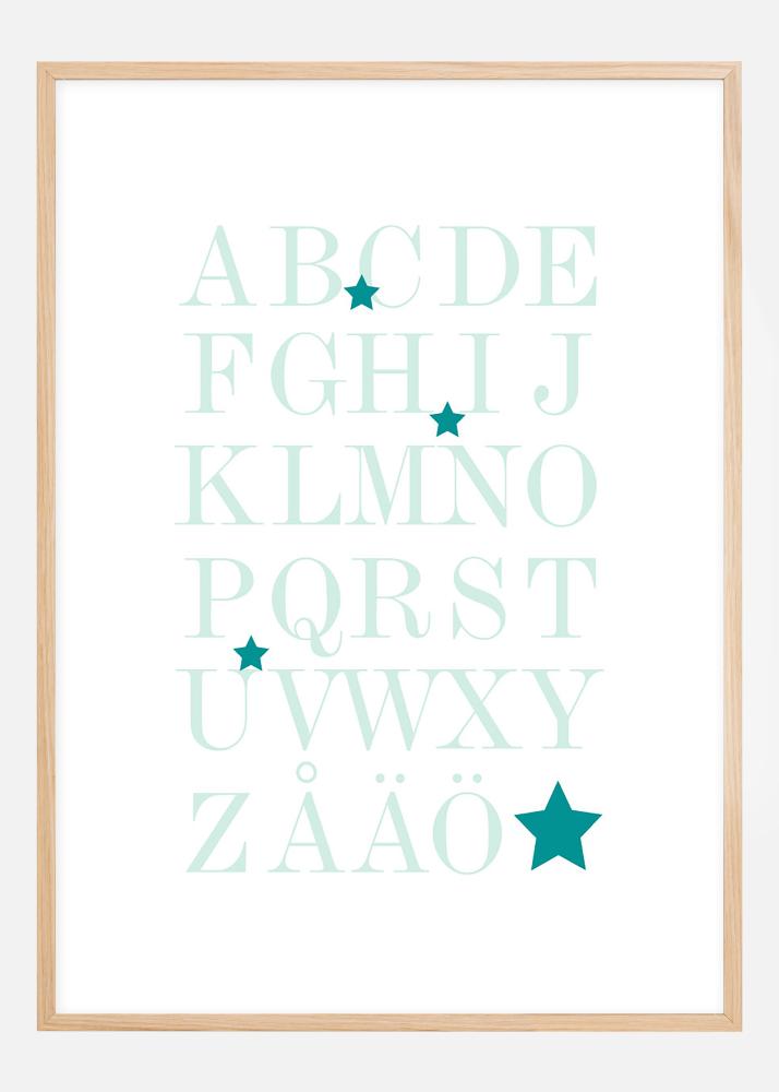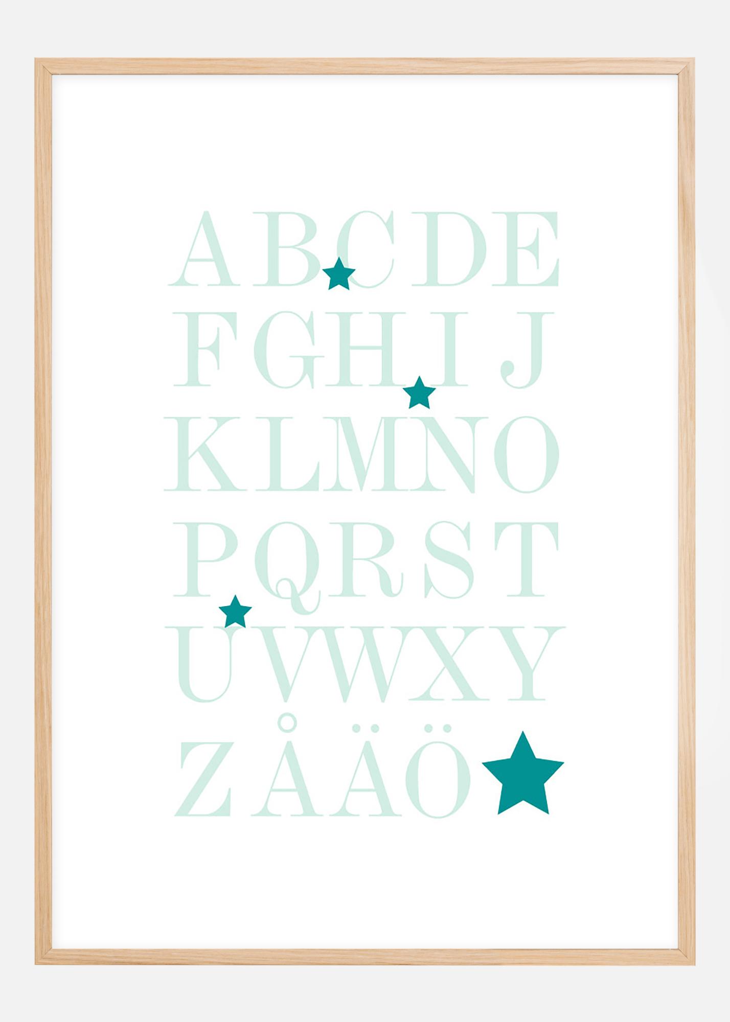 Impresión gráfica con todo el alfabeto sueco, A-Ö, en tonos verdes y turquesas del mar. El motivo educativo es adecuado para practicar el alfabeto en la habitación de los niños, pero también en otras paredes de la casa. La expresión elegante hace que el póster se adapte a todos los estilos de decoración y tipos de hogar. Combínalo con otros cuadros para crear una pared temática o decora la pared junto con el póster de los números del 1 al 10.