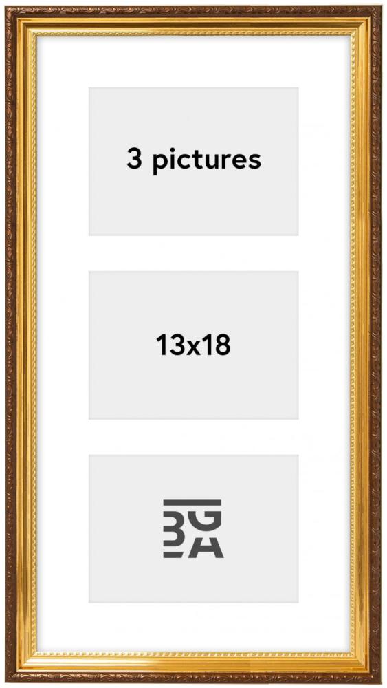 Con este marco de collage puedes decorar tu pared con fotos de la familia, amigos y recuerdos fotográficos de momentos hermosos de la vida. El marco tiene espacio para 3 fotos de tamaño 13x18 cm. El marco dorado tiene un hermoso estilo retro con un borde exterior decorativo en un cálido tono marrón. Incluye soporte para colgar en la pared.
