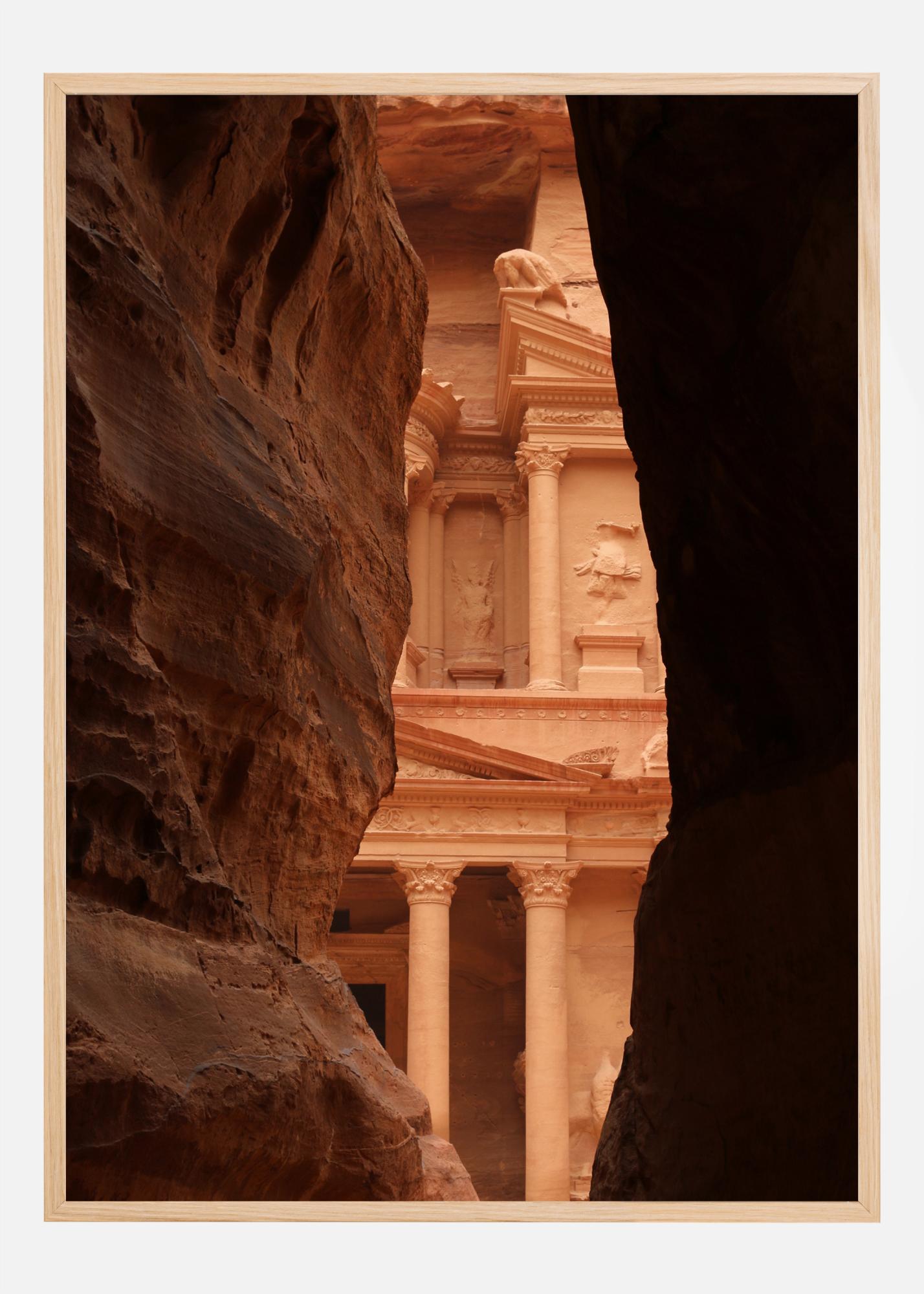 Un póster icónico de una esquina de Petra en Jordania. Observa una parte de la fachada a través de las rocas rojas de esta maravilla antigua. Cuélgala y emprende un viaje sin salir de tu hogar, mientras exploras la arquitectura antigua de este lugar famoso.