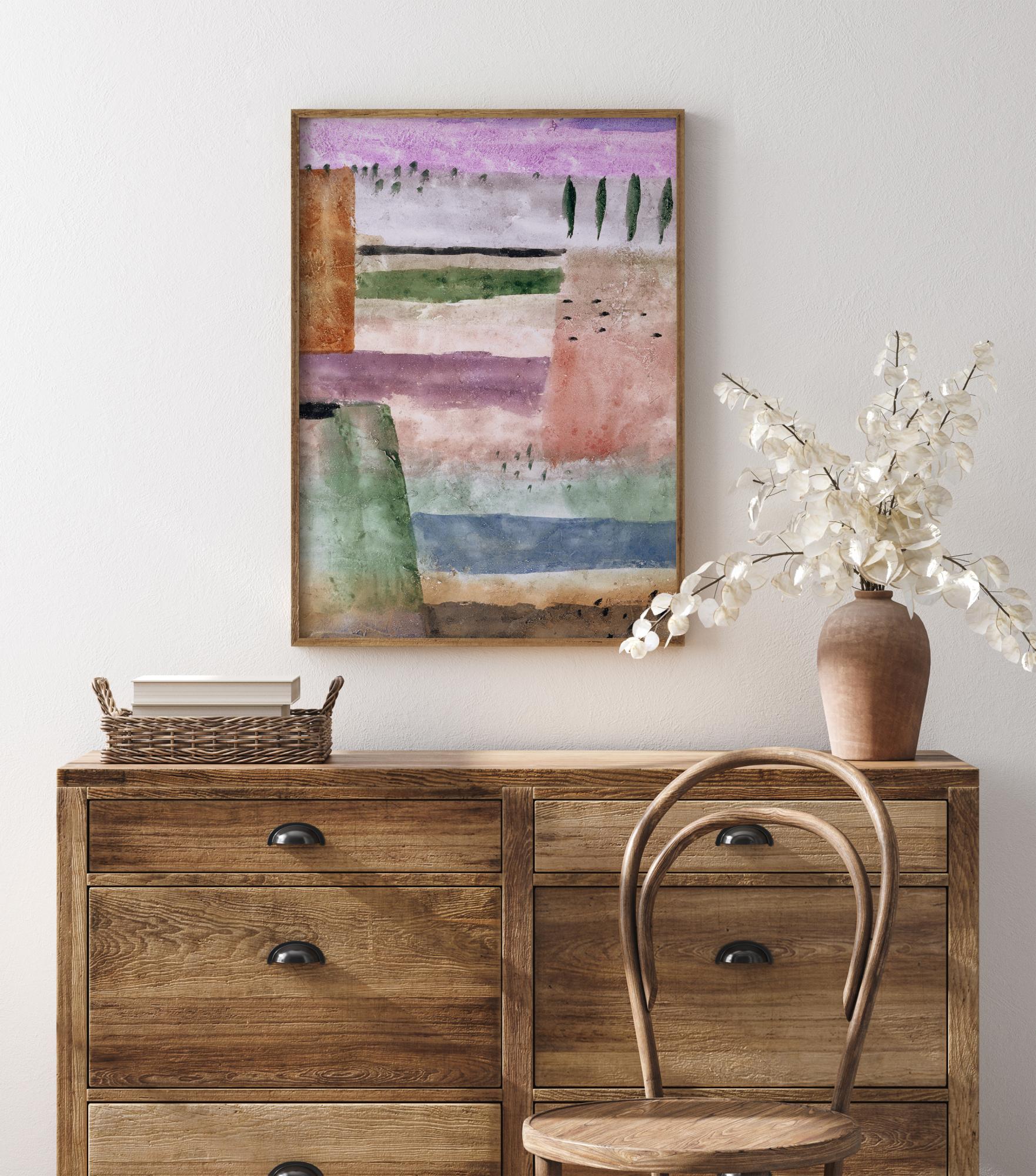 Un póster abstracto de colores pasteles con una sensación de textura en capas. El póster muestra lo que parece ser una playa, el mar, montañas, hierba y árboles que se desvanecen en la distancia. Hay varios campos en tonos pasteles suaves de azul, lila, naranja y verde. Esta escena tranquila es calmante para la mente.