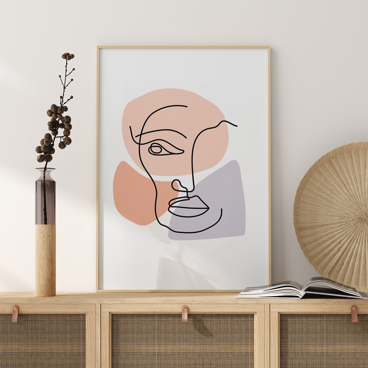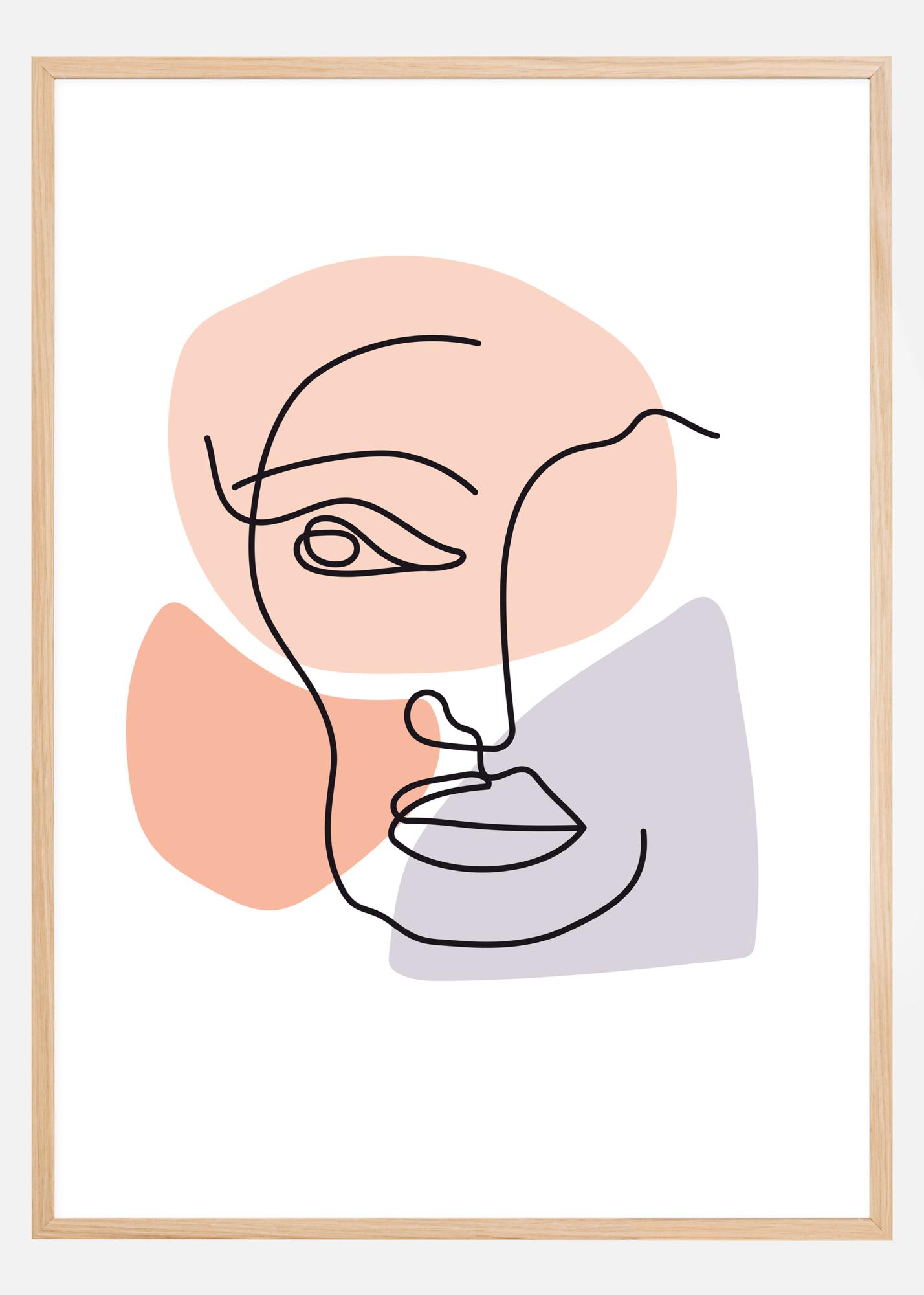 Un póster abstracto de un rostro contemplativo que dessoporterta la curiosidad. Líneas finas de garabatos negros crean la nariz, los ojos, la boca y la barbilla de este rostro alerta. Formas suaves en tonos azules, rosas y melocotón se encuentran debajo para dar forma al rostro. Combínalo con una pared de color fuerte para obtener una declaración realmente impactante que estimule la imaginación.