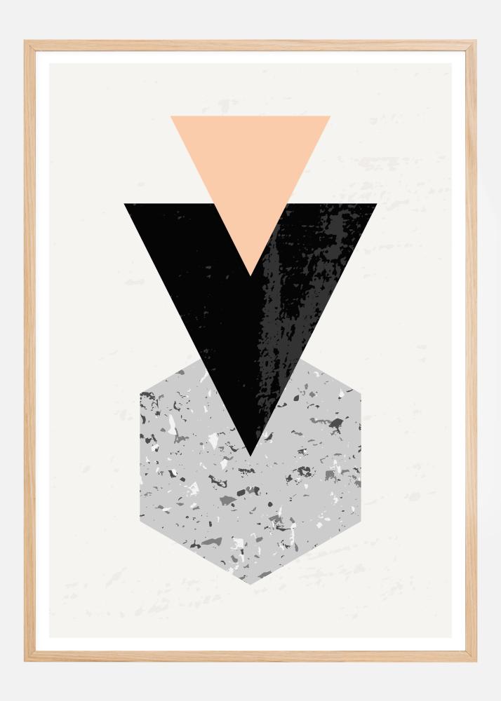 Un póster geométrico triangular con formas brillantes y audaces. Los dos triángulos en rosa y negro apuntan hacia abajo, dirigiendo la mirada hacia el cubo azul más suave y punteado. El triángulo negro centralizado mantiene el enfoque, lo que lo convierte en una presentación perfecta para la oficina en casa, con su diseño menos distractor que es compatible con cualquier habitación.