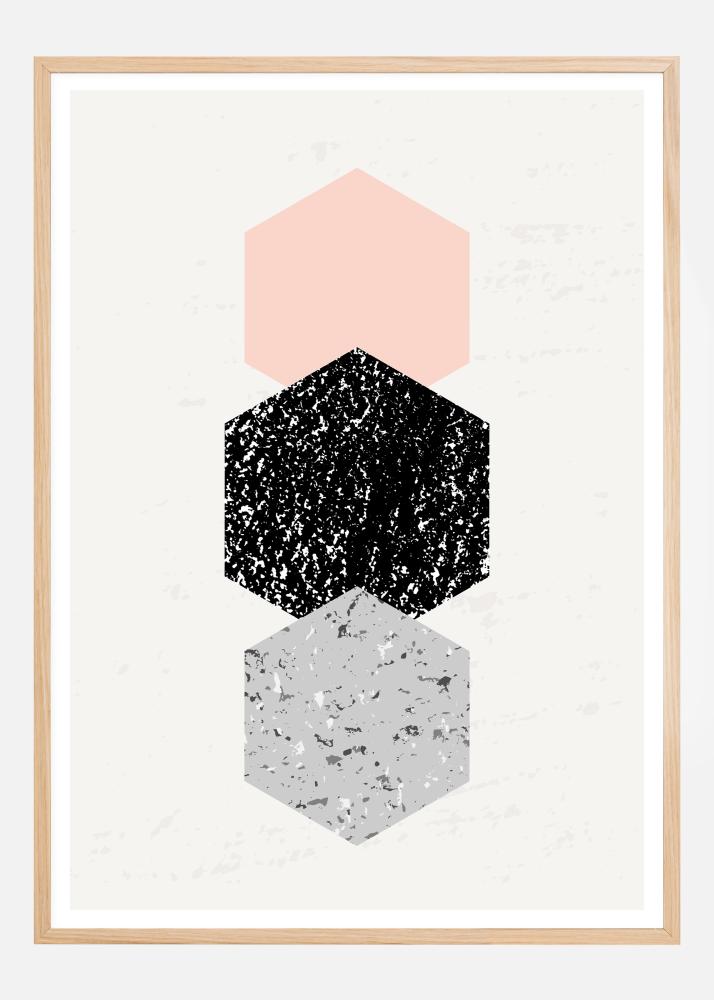 Un póster abstracto con hexágonos con tres hexágonos encima uno del otro. El superior es de color rosa suave, el mediano en el centro es una forma moteada en blanco y negro, y el inferior es un hexágono marmolado en azul. El ojo sigue a través de esta obra, sin distracciones, perfecta para una oficina en casa.
