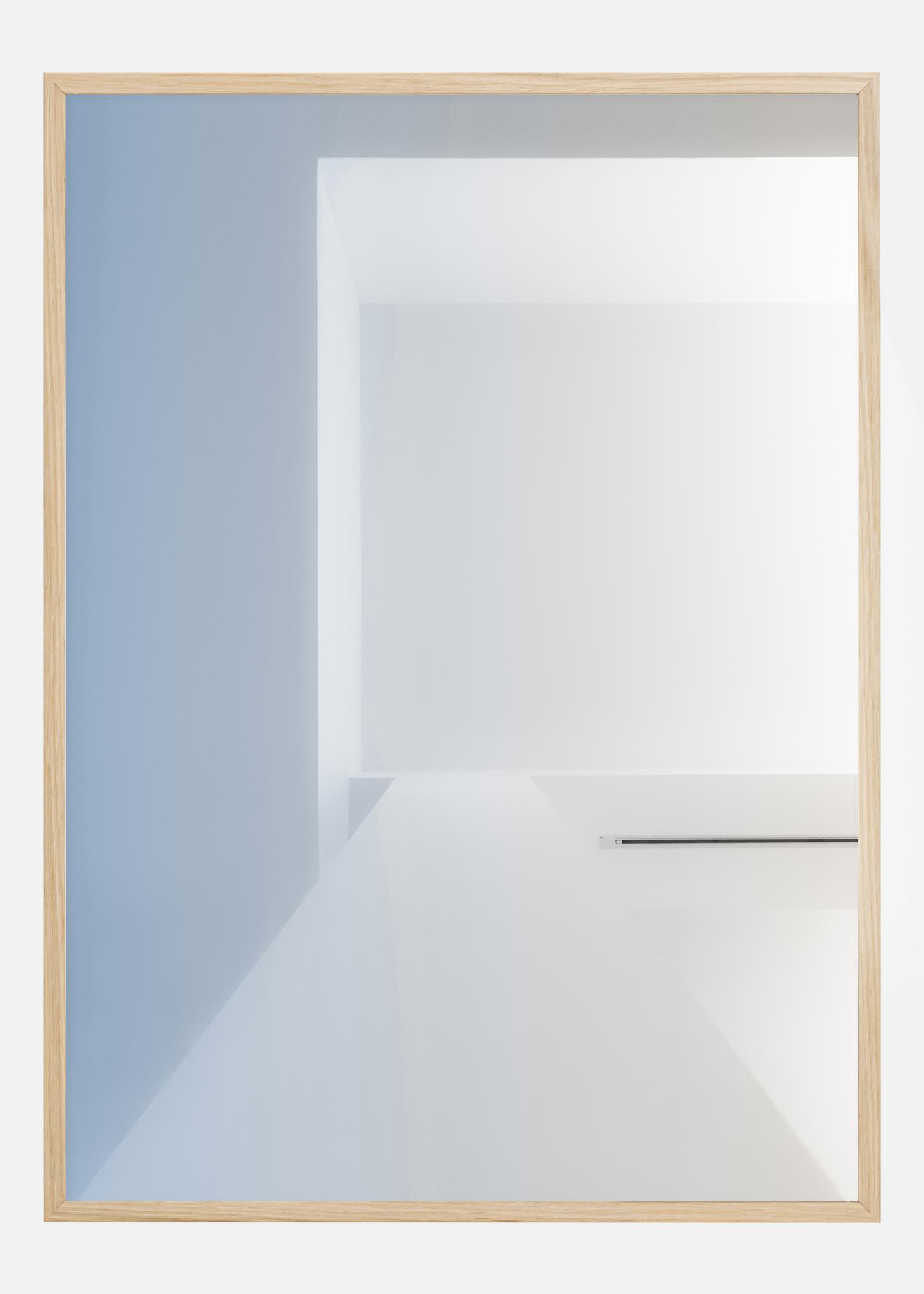 Un póster abstracto para decoración con tonos tranquilizantes de azul y blanco. El fondo principal es de un azul suave con un cuadrado blanco que parece una ventana y una encimera. Un estallido de blanco suavemente deslumbrante a la derecha da la sensación de que el sol irrumpe para aportar un toque de tranquilidad a tu hogar.