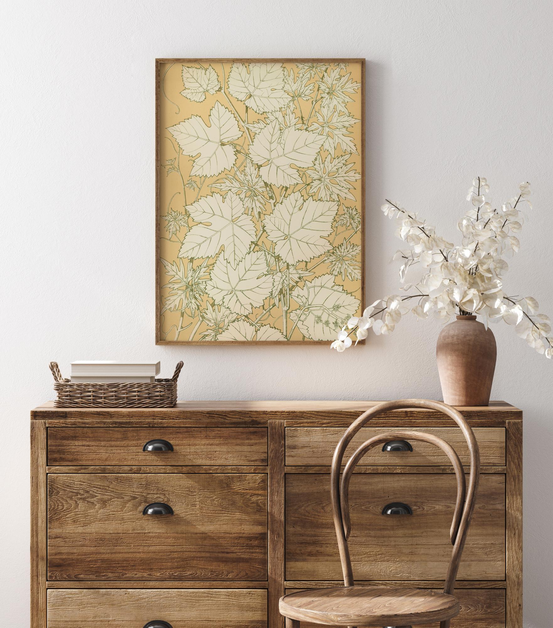 Un póster de naturaleza con hojas sobre un fondo naranja pastel. Las hojas están dibujadas con tinta negra y sin color, lo que hace que resalten como un diseño de impresión sobre el fondo de un solo color. Dale vida a una pared lisa en casa con esta sencilla obra de arte en estilo de impresión cuando traigas un pedazo de la naturaleza al hogar.
