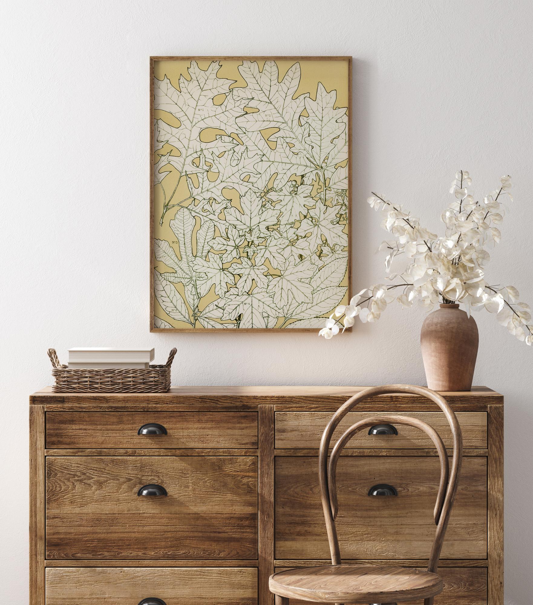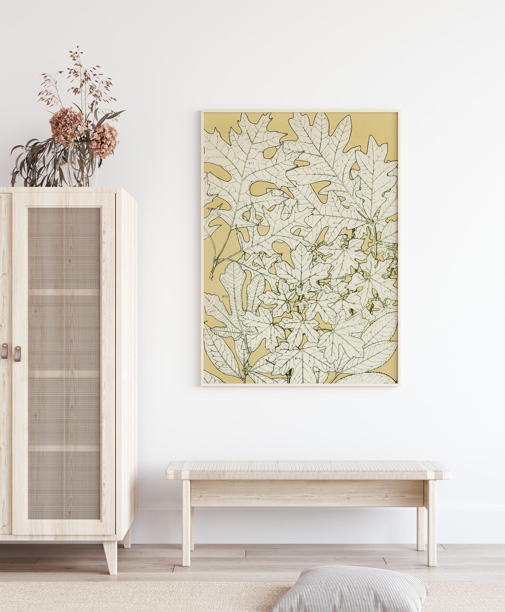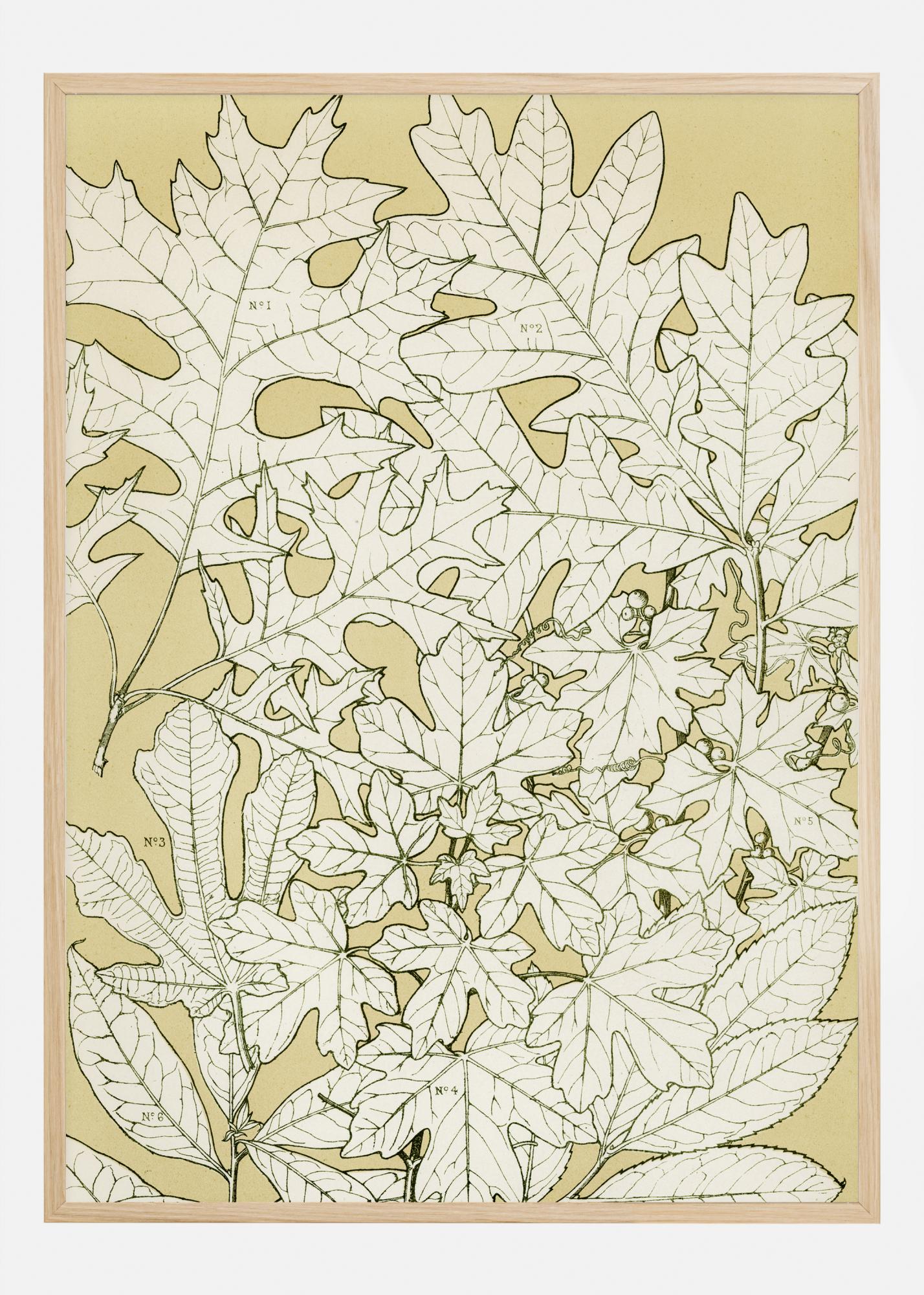 Un póster abstracto de hojas con dibujos sencillos de hojas sobre un fondo dorado pálido. Diferentes hojas están dibujadas cuidadosamente con sus venas foliares y tallos. La falta de color hace que resalten contra el fondo sólido, mostrando todos los detalles. Cuelga este póster en una pared sencilla para darle una sensación natural a tu hogar.
