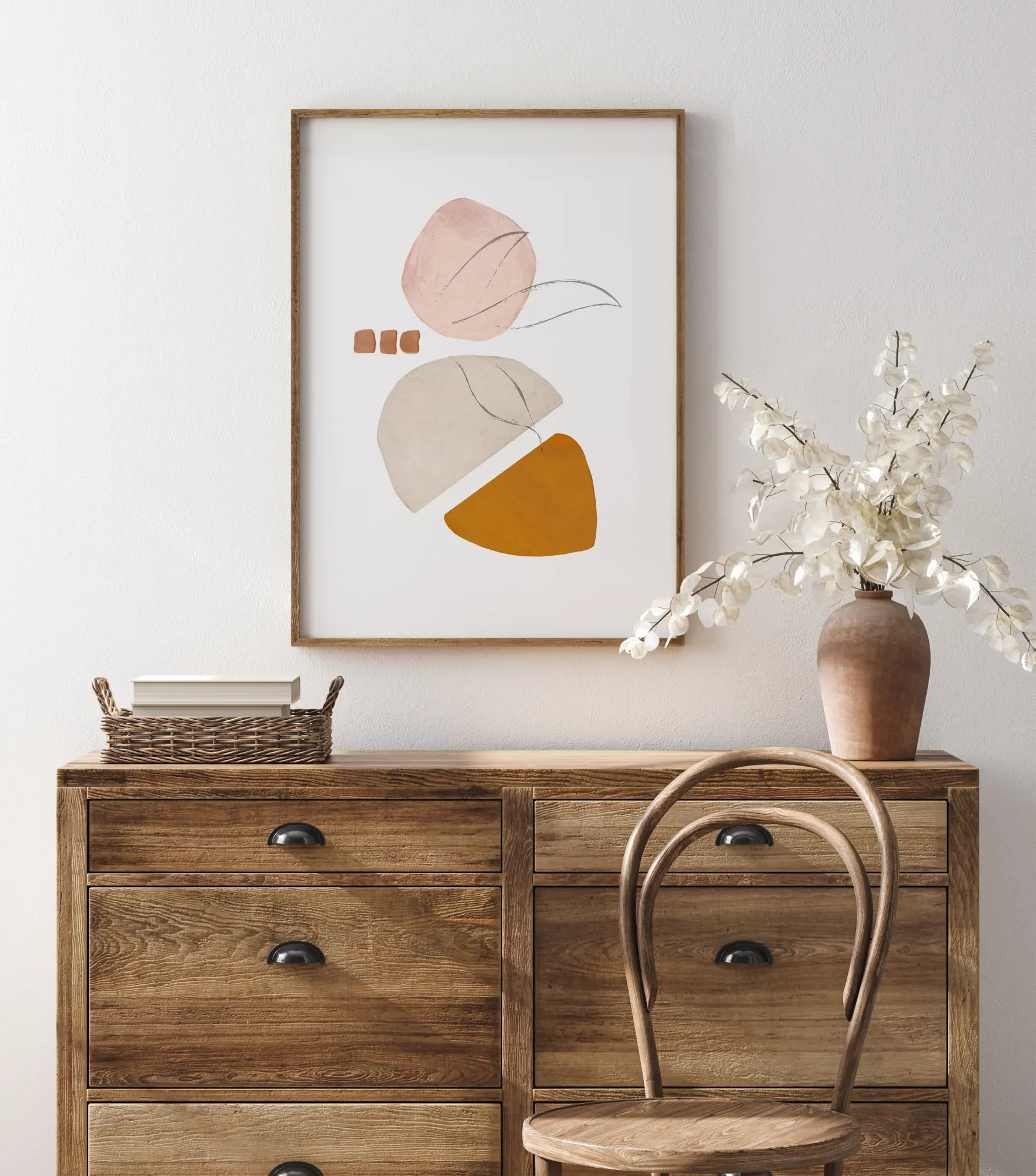Un póster abstracto suave de un insecto. La imagen consta de tres formas principales con dos colores pastel, que se unen con una forma naranja más fuerte. Las alas suaves se dibujan con pinceladas ligeras que crean toda la imagen. Comienza a hablar con tus invitados sobre lo que esta imagen significa para ti después de haberla llevado a casa.
