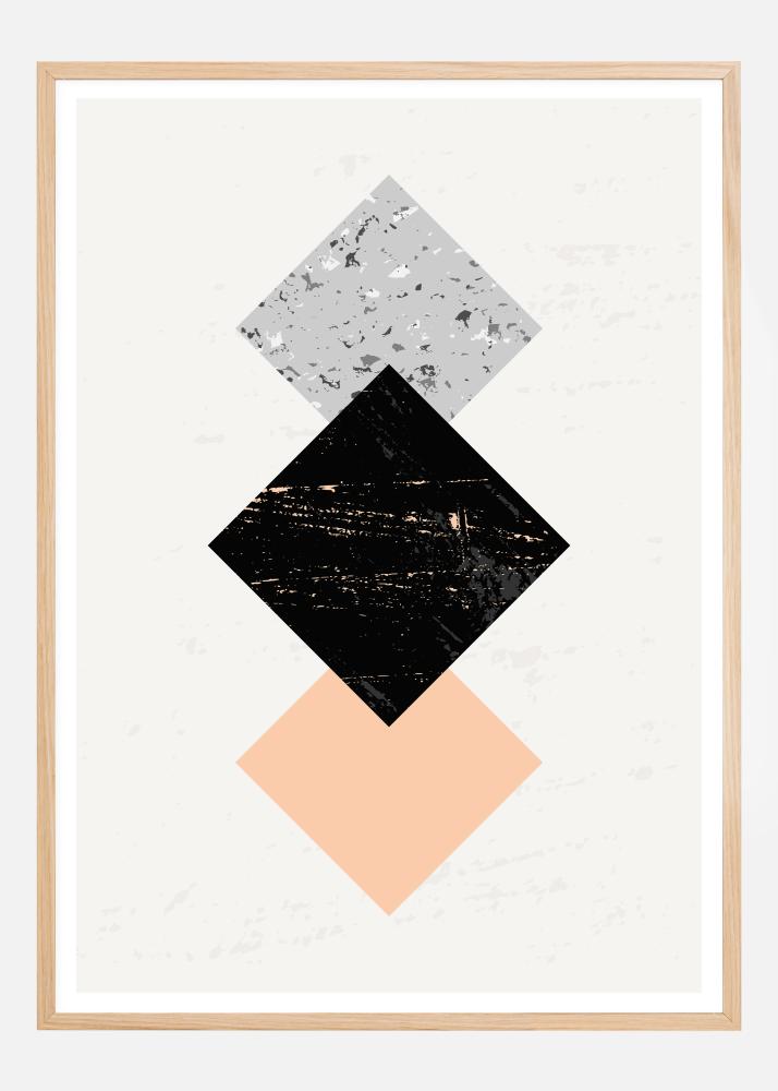 Un póster geométrico con tres cuadrados de diferentes colores. Una imagen más suave donde el enfoque está en un cuadro negro, pero a su vez se suaviza con un cuadro azul encima y un cuadro rosa debajo, ambos con patrones adicionales. Aporta un toque drama sin ser abrumador cuando cuelgues este póster en el recibidor o en cualquier habitación con luz natural.