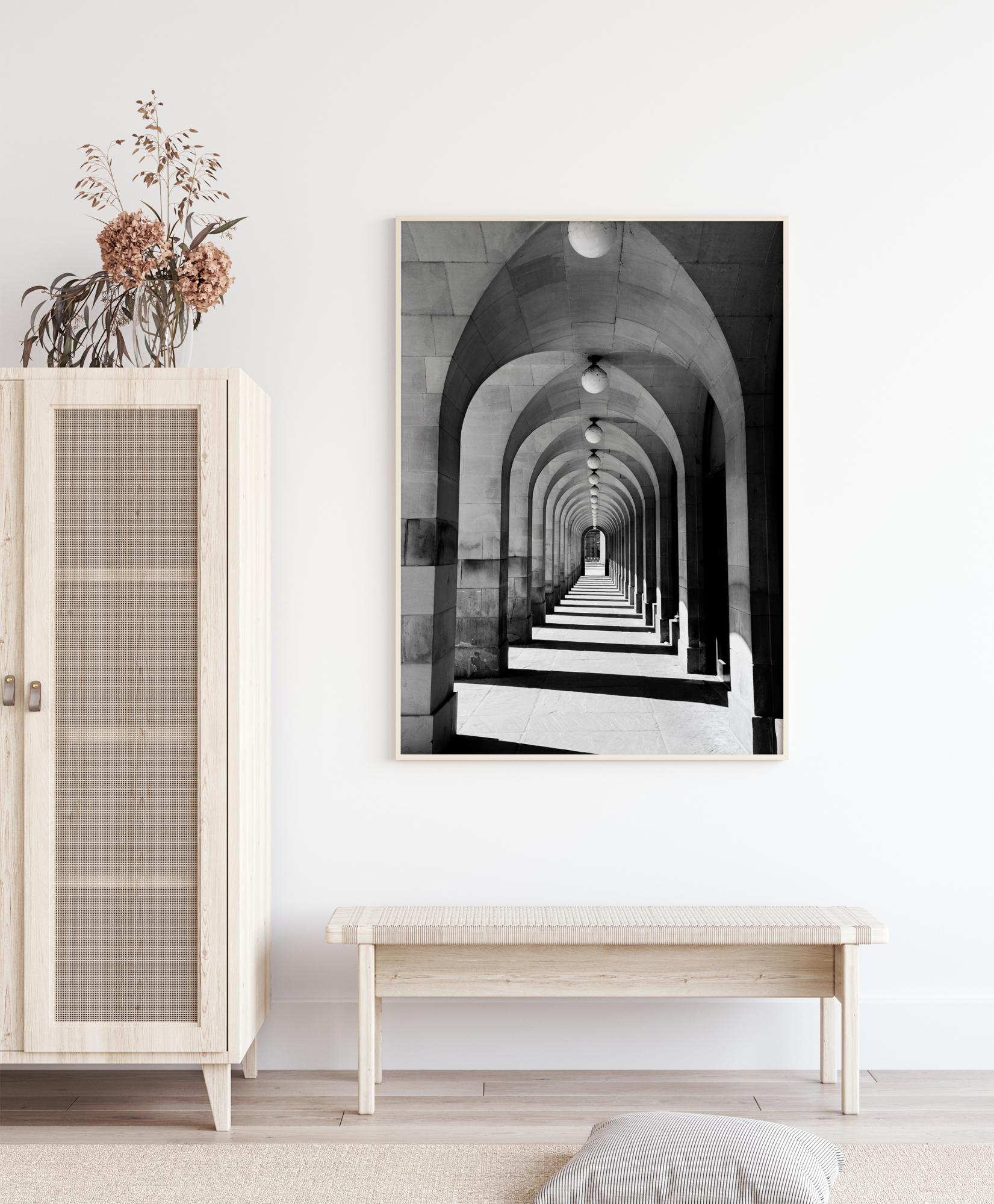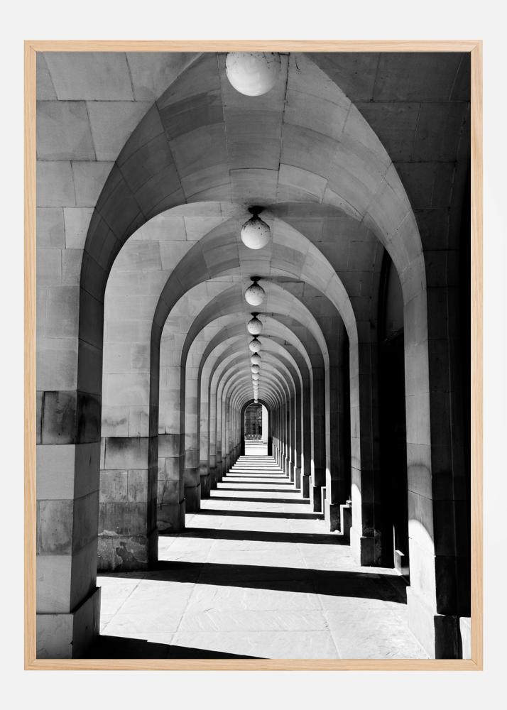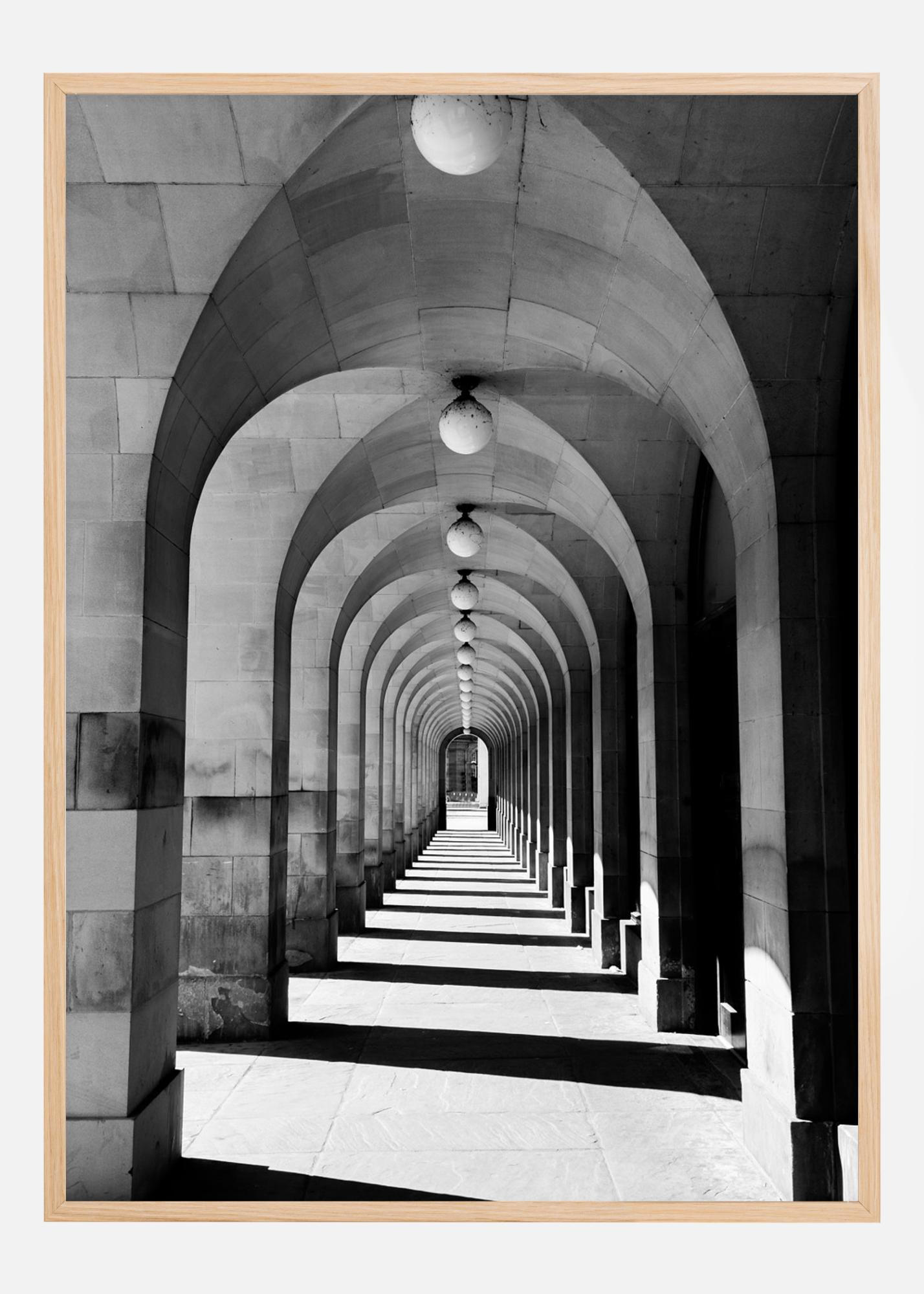 Un póster de un largo pasaje abovedado. Cada uno de los arcos dirige la mirada hacia abajo a lo largo del recibidor mientras desaparece en la distancia. Los tonos grises hacen que las sombras en cada arco se destaquen en la luz. Obtén la sensación de que la habitación se vuelve más grande cuando cuelgas esto y sigues el recibidor con la mirada.