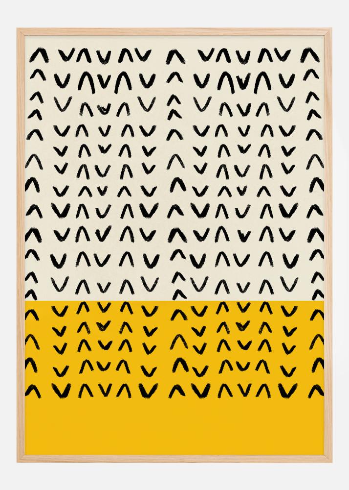 Experimenta la estética moderna y minimalista con este artístico póster. El diseño presenta una composición rítmica de formas abstractas y negras que se mueven sobre un fondo suave y neutral. El motivo está claramente dividido por una poderosa sección amarilla en el tercio inferior, que añade un contraste audaz a la parte superior predominante tranquila y armónica. Este póster es perfecto para el individuo consciente de las tendencias que busca introducir una sensación contemporánea y elegante en su hogar u oficina.