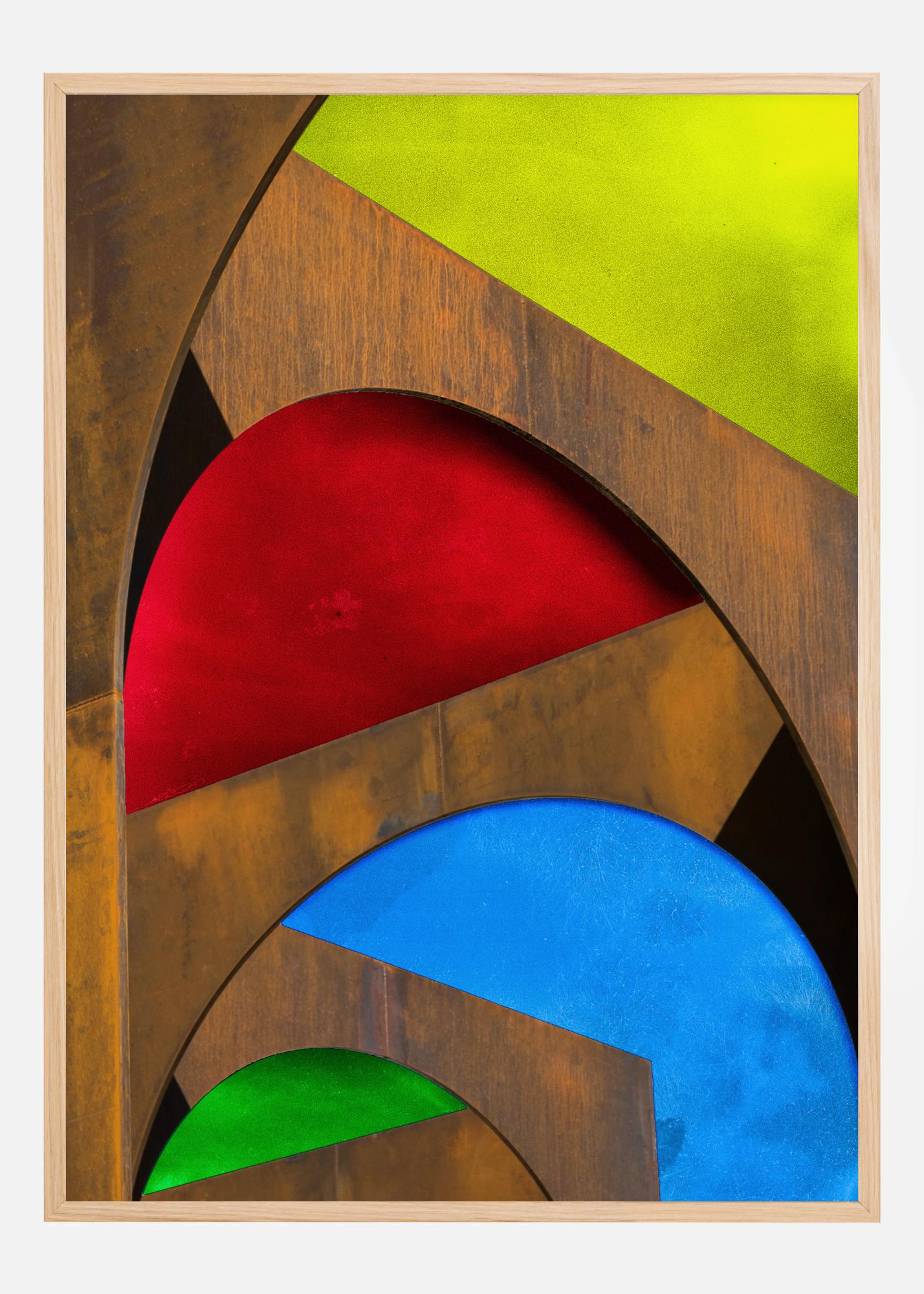 Un póster abstracto brillante con formas coloridas. Los colores primarios llenan esta obra con formas semicirculares rojas, amarillas y azules. Estas formas están unidas con cortes rectos de madera sobre un fondo negro. Dale vida a una pared aburrida y lisa o combínala con otro color audaz existente para complementar la obra.
