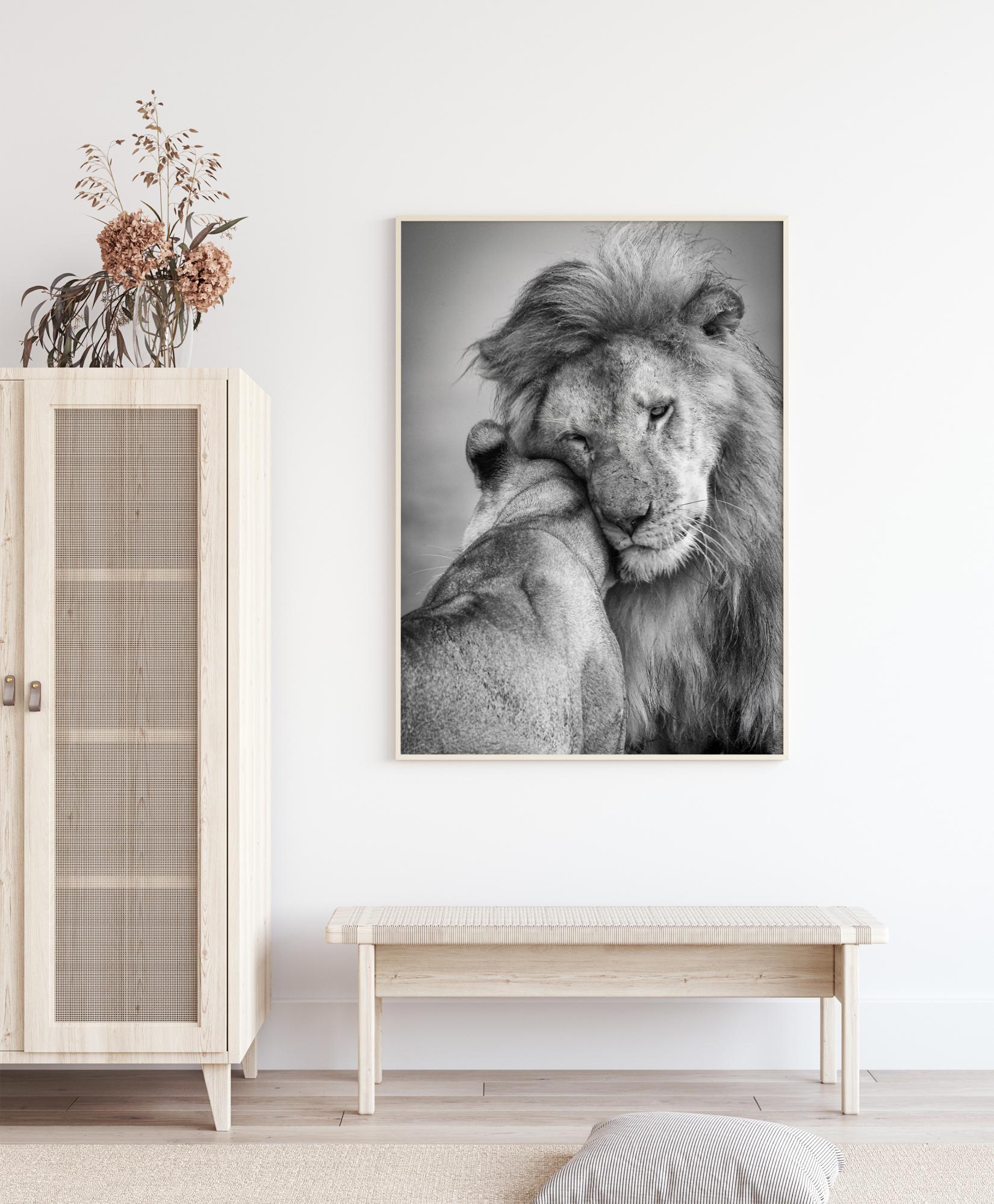 Un póster de naturaleza con un león y una leona en un momento tierno. En esta fantástico imagen en blanco y negro, puedes ver al león macho abrazando a su leona mientras ella está acostada de espaldas a él. Experimenta el amor en este cálido abrazo cada mañana cuando te levantes.