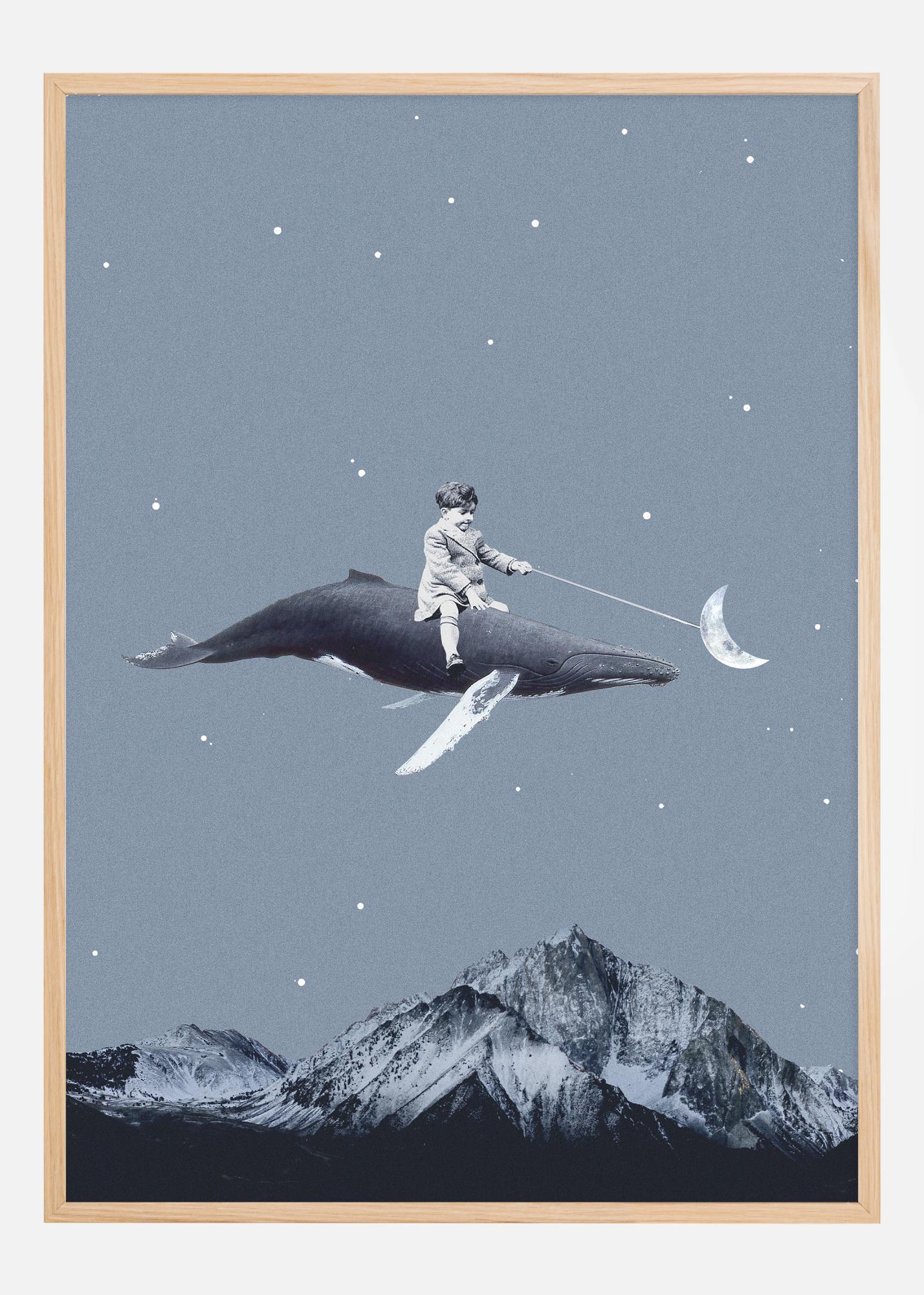 Este póster creativo e inspirador retrata a un joven explorador que, montando una ballena, atrapa la luna con un palo. Simboliza la aspiración y el sueño de alcanzar lo que parece imposible. Los cielos estrellados y el robusto terreno montañoso debajo transmiten una sensación de aventura y exploración en lo desconocido.