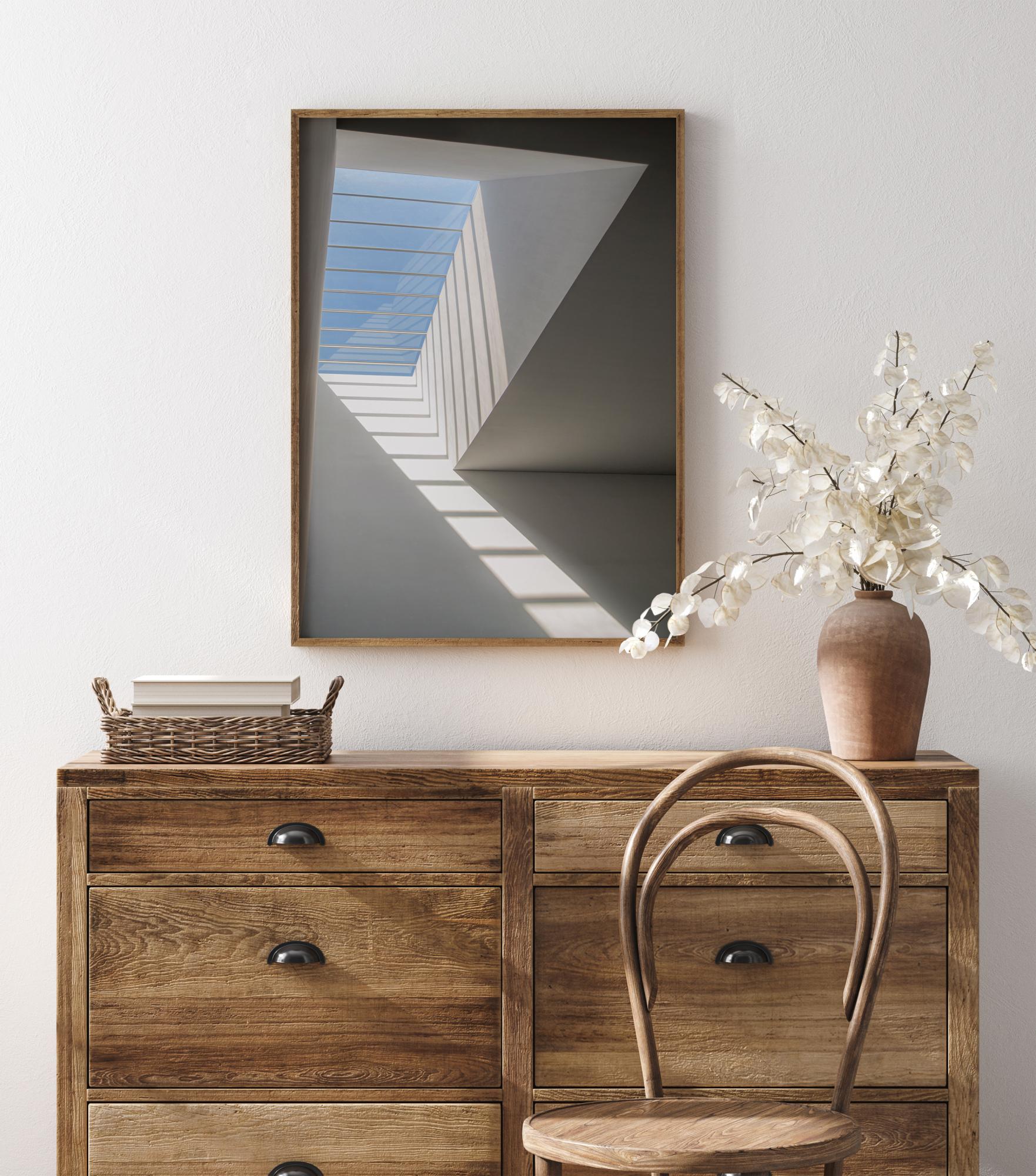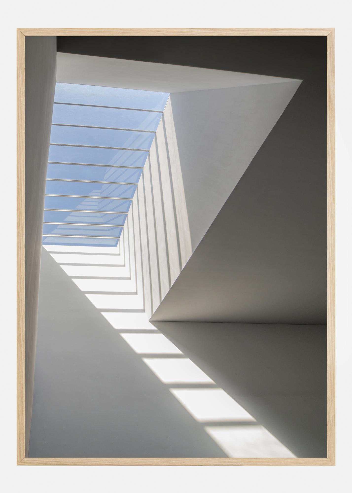 Un póster sencillo y aireado en una habitación blanca y luminosa. A la izquierda hay un altillo con un cielo azul. La luz que se filtra crea sombras que parecen una escalera que guía la mirada hacia la luz exterior. Haz que brille en una habitación oscura con esta imagen tranquila.