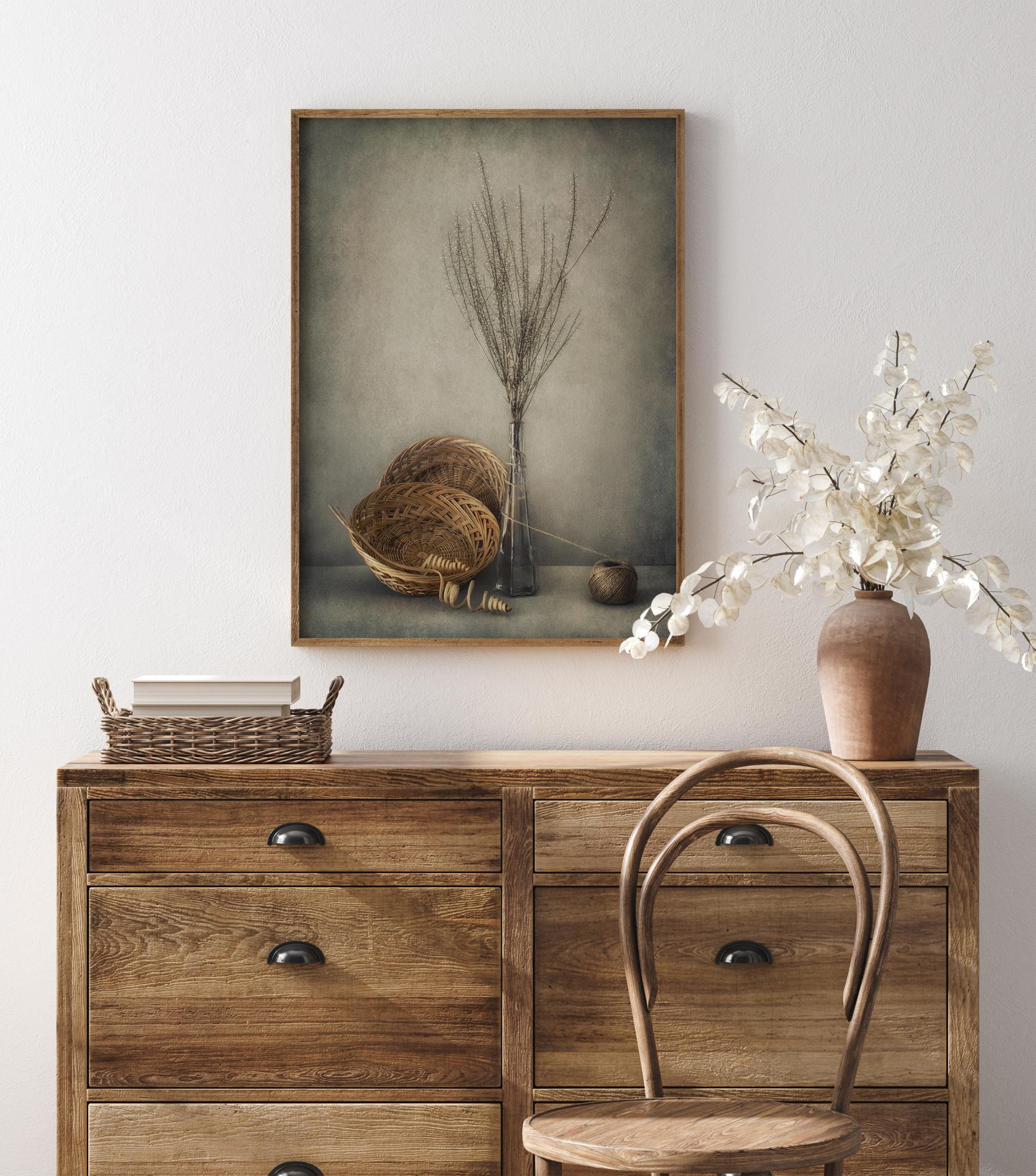 Un póster de bodegón (naturaleza muerta) con cestas, una maceta de barro y una botella de vidrio con hierba seca. Esta obra tiene sutiles tonos sepia y grises que crean una obra suave y armoniosa. Obtén un poco de tranquilidad en tu hogar con este póster y combínalo con una pared neutral para que no destaque demasiado.