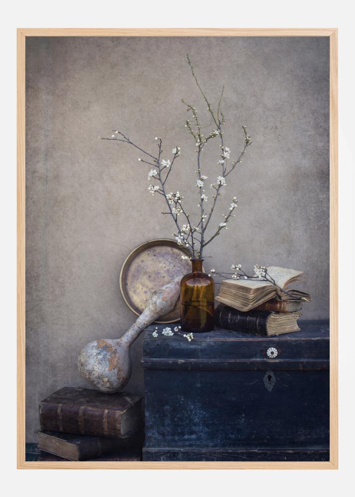 Un póster de bodegón (bodegón (naturaleza muerta)) de un cofre azul con un jarrón, un plato, libros antiguos y flores en brote. La bodegón (naturaleza muerta) está sobre un fondo gris sencillo que hace que el cofre azul se destaque en el centro. Si quieres tener una sensación rústica, puedes colocarlo en una pared neutral y disfrutar de las flores de primavera en brote en las ramas desnudas.