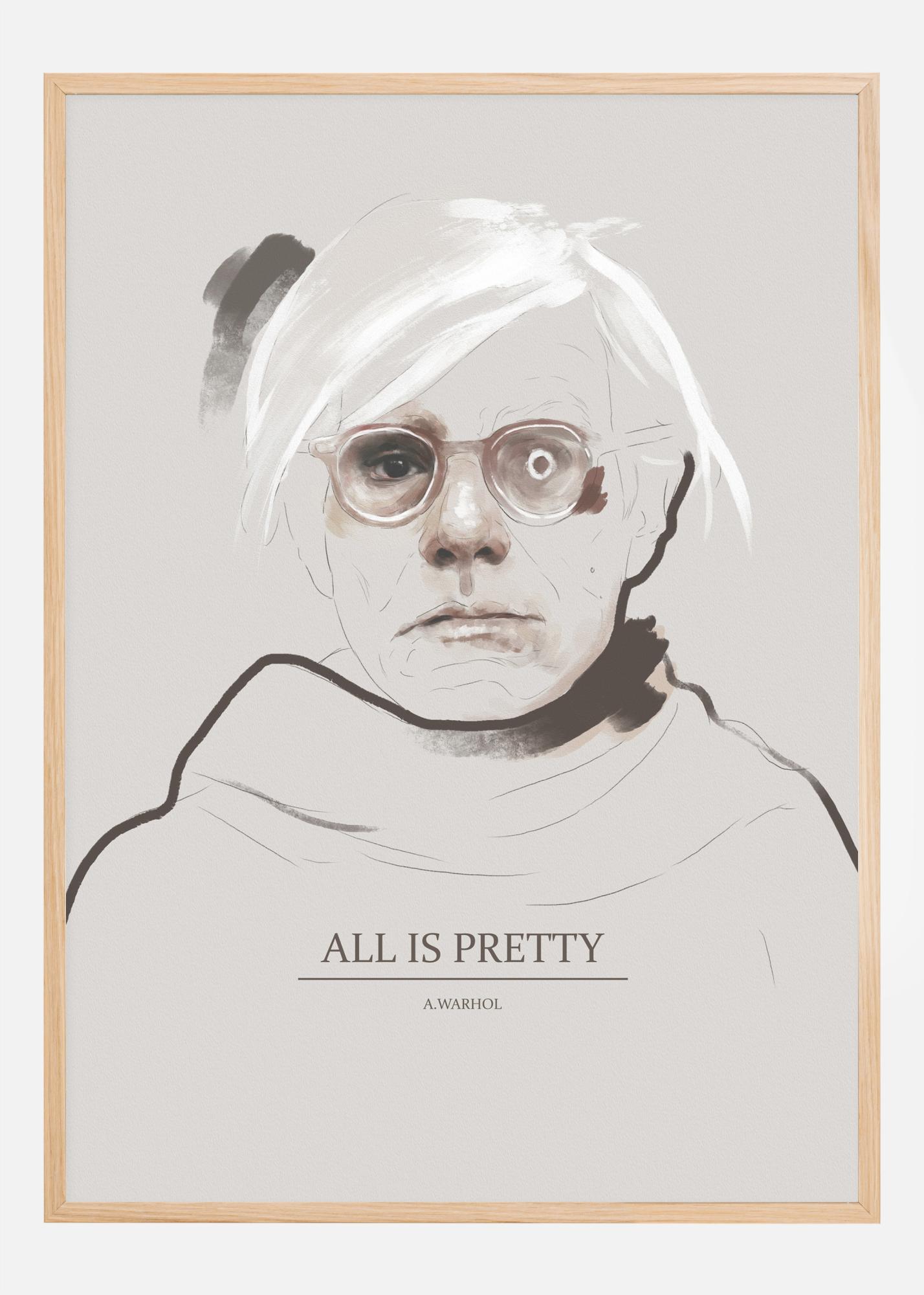 Un póster de retrato de Andy Warhol. Esta obra experimental muestra un retrato del artista sobre un fondo gris. Su cabello blanco y su ojo maníaco y mirada intensa son un buen punto focal en una pared clara al estilo del arte pop. Captura la cita inspiradora y déjate inspirar mientras pasas junto al póster en casa.