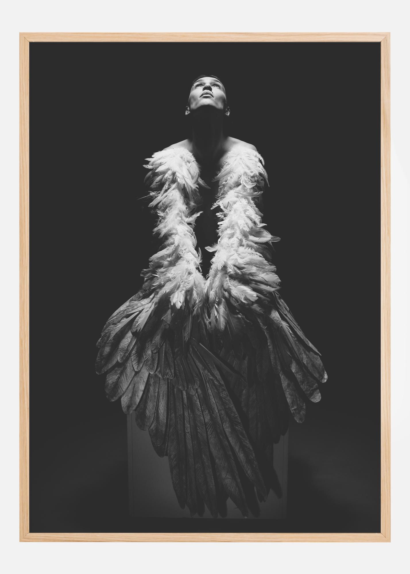 Un retrato de un hombre vestido con un traje de plumas largas para imitar un vuelo en el aire. Está parado contra un fondo negro y mira hacia arriba al cielo. Un foco ilumina desde arriba, resaltando su rostro y hombros, lo que hace que automáticamente te enfoques en él cuando miras esta obra dramática.