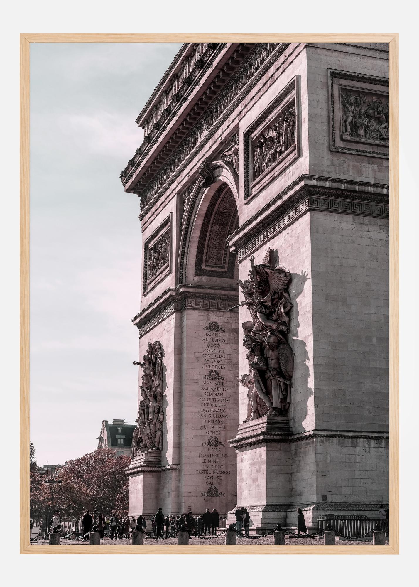 Este elegante cartel destaca la majestuosa y detallada arquitectura del Arco del Triunfo en París. En esta impresión única se captura la grandeza y el detallismo del famoso monumento, desde las poderosas esculturas que adornan sus pilares hasta las finas decoraciones e inscripciones que narran su importancia histórica. Con un tono ligeramente rosa que crea una atmósfera cálida, esta imagen es un homenaje a la historia y arquitectura francesa, y se convierte en una adición cultivada a cualquier colección de arte y carteles.