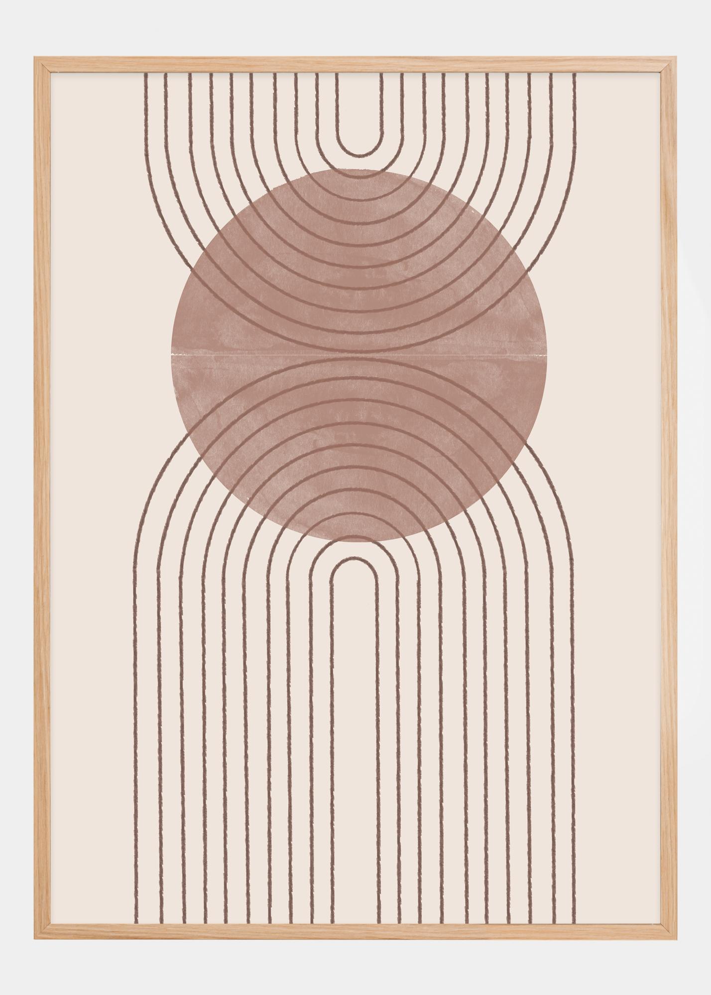 Este póster invita a una sensación de calma y flujo orgánico con sus suaves líneas ondulantes que se reúnen alrededor de un círculo central en un cálido tono terracota. El patrón relajante recuerda a las dunas de arena formadas por el viento, o las tranquilas olas que ruedan hacia la playa, y ofrece un momento de reflexión y tranquilidad.