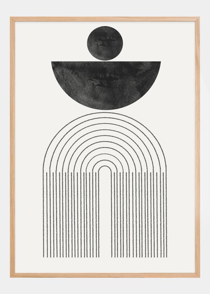 Este póster audaz y sugestivo es una interpretación elegante de los ciclos de la luna y la armonía de los cuerpos celestes. El semicírculo negro y el círculo completo arriba ilustran las diferentes fases de la luna, mientras que las líneas ondulantes debajo se asemejan a pilares arquitectónicos o portales a otra dimensión. El contraste en blanco y negro de la obra de arte aporta una sensación de elegancia y misticismo que enriquece cualquier habitación.