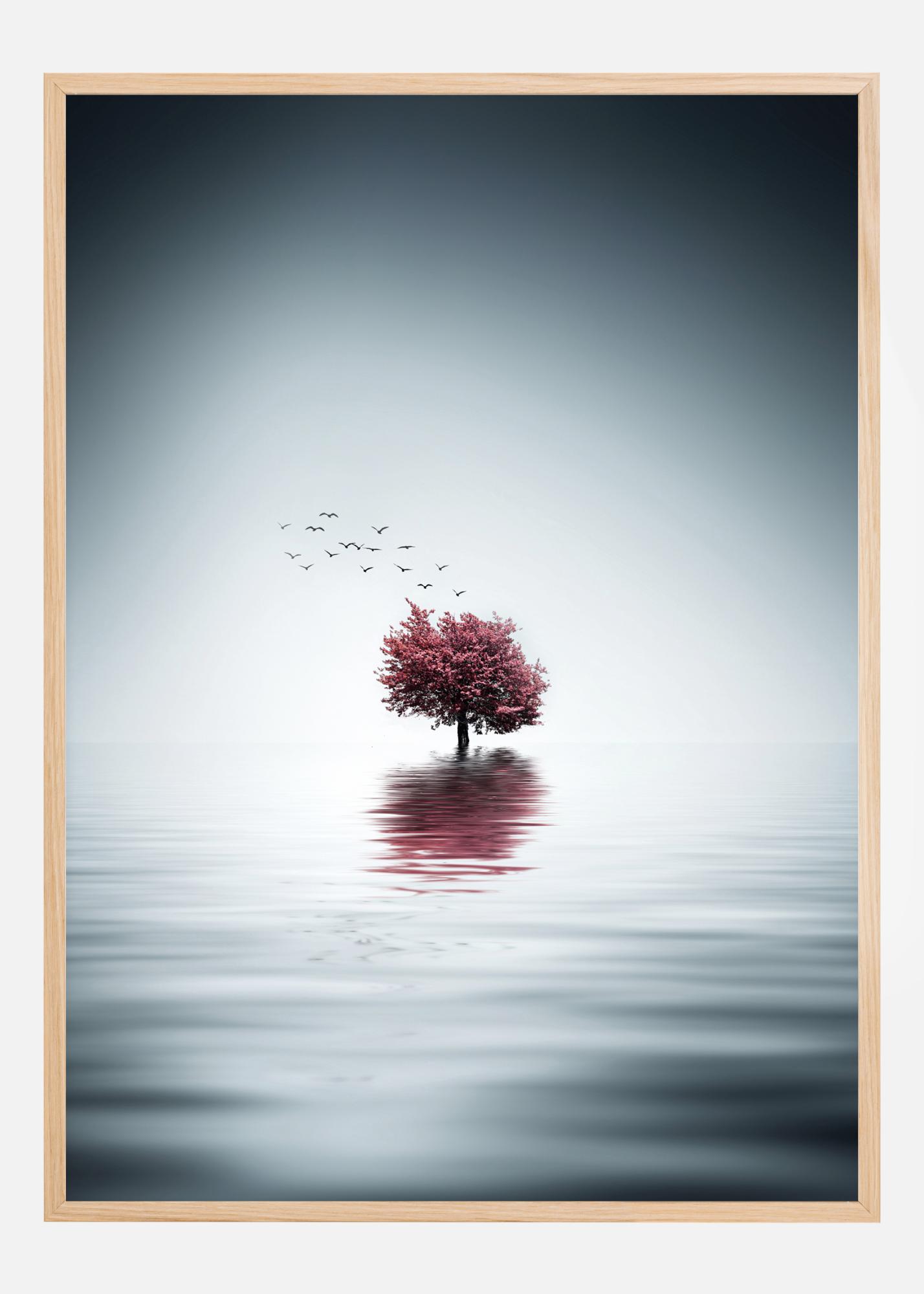 Una sencilla postal de la naturaleza de un lago con un árbol solitario en el centro. Los colores vívidos y las ondulaciones dirigen la mirada hacia el pequeño árbol de cerezo con flores rosas. Un grupo de pájaros vuela lejos en un halo de luz. Puedes sentir realmente la mística de la naturaleza en esta imagen.