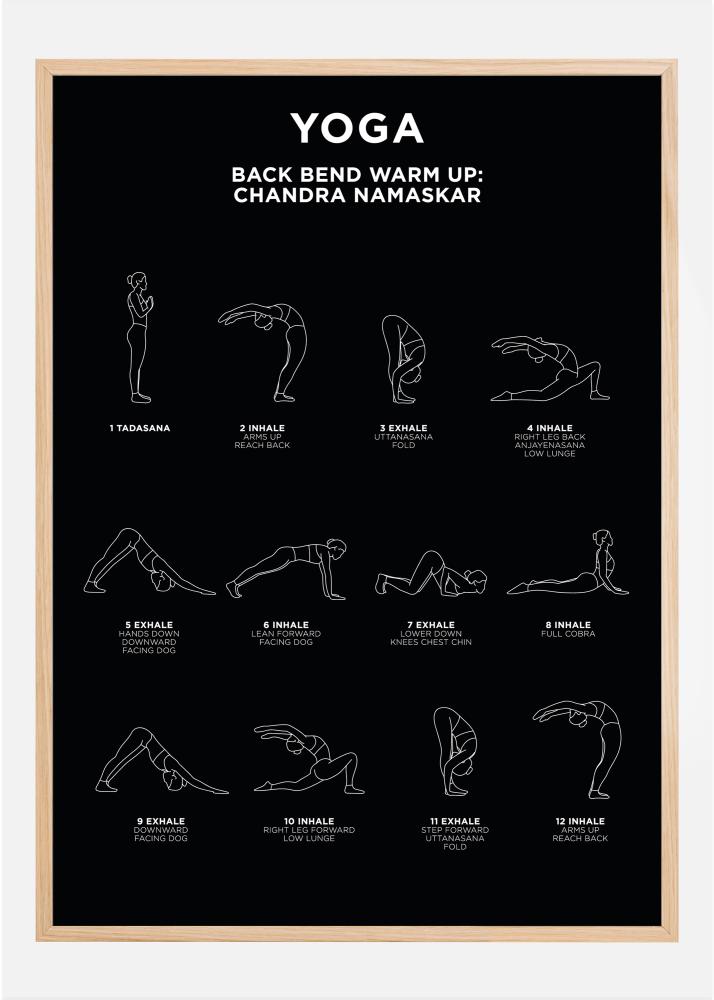Póster de moda que se combina ventajosamente con otros motivos para crear una pared de cuadros de tendencia. El póster es elegante con un diseño minimalista, pero también sirve como una mano amiga cuando quieres aprender uno de los ejercicios clásicos de calentamiento del yoga “Chandra Namaskar”. El póster está disponible en negro o blanco y en una variedad de tamaños.