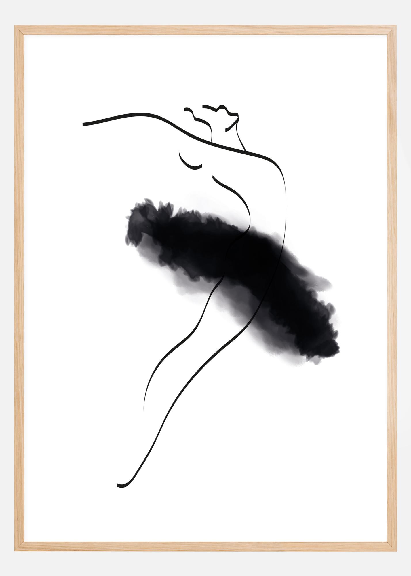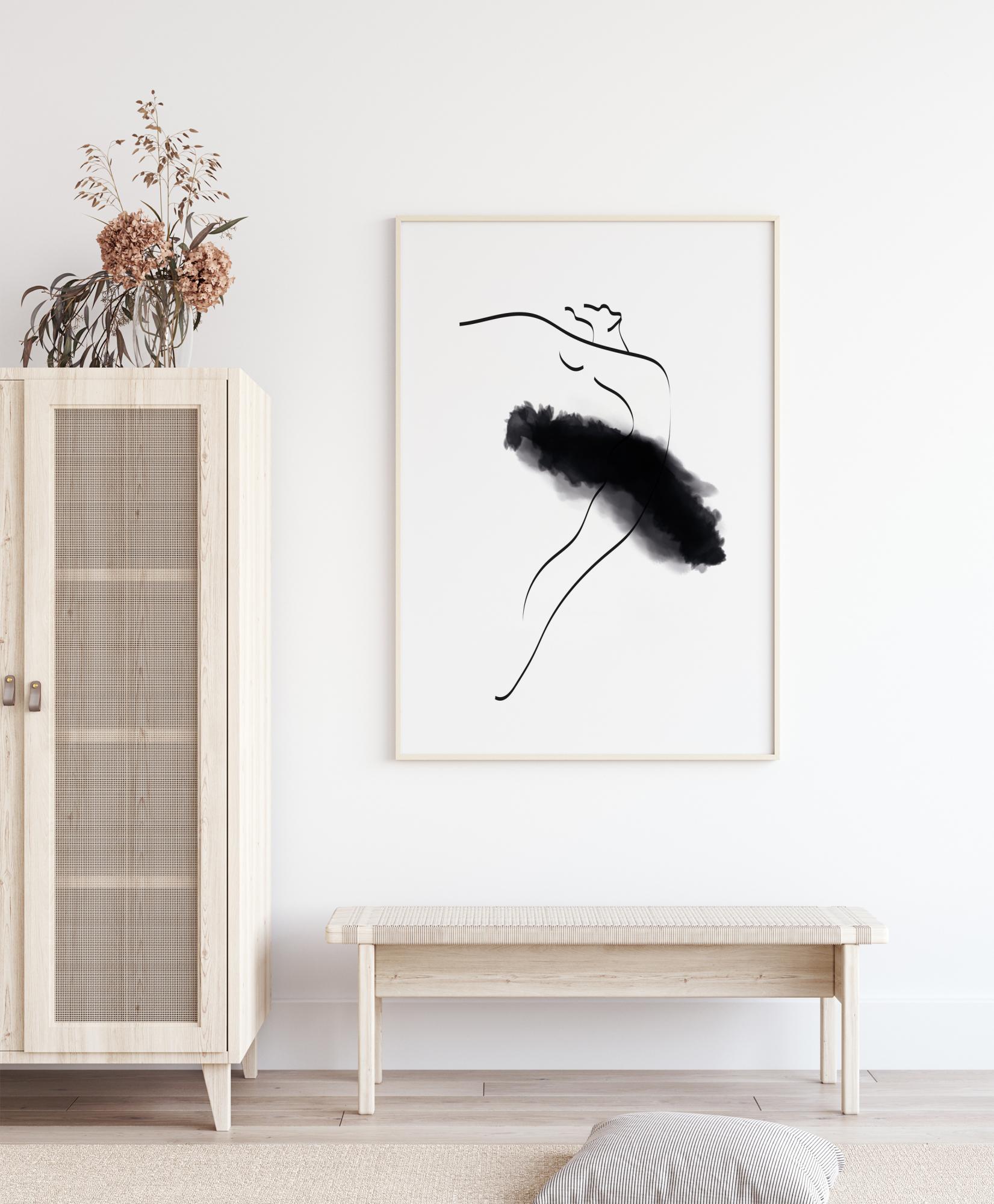 Una acuarela de una bailarina en líneas finas negras con una falda de ballet negra más pronunciada. Un póster minimalista y elegante que se adapta tanto en el dormitorio o en el recibidor, como en la sala de estar o en la biblioteca.