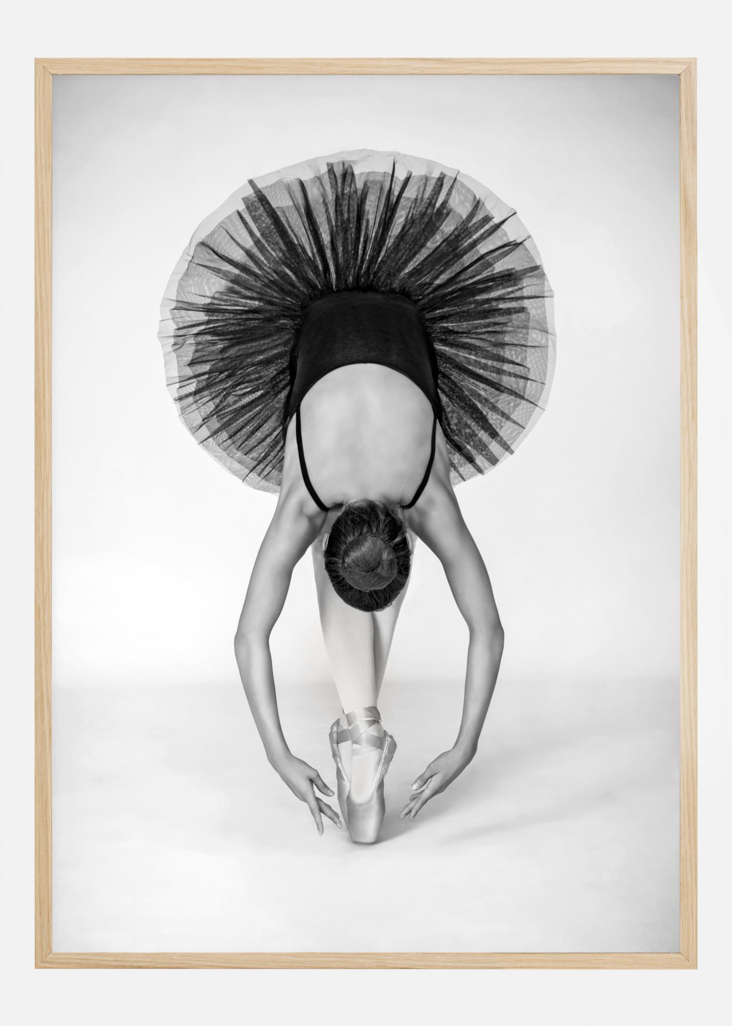 Un póster de retrato de una bailarina. Esta bailarina de ballet se inclina hacia adelante en quinta posición y crea dos círculos perfectos con sus brazos y un tutú negro. El póster en blanco y negro la hace destacar y crea una apariencia elegante y clásica que realza cualquier pared neutral en cualquier hogar.