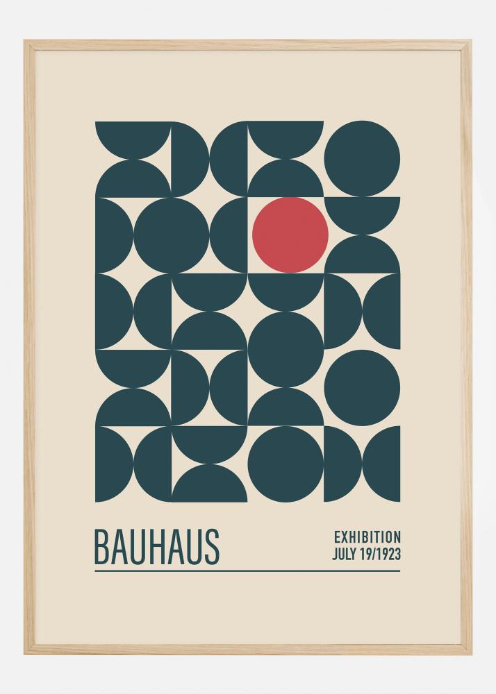 Este póster captura la esencia minimalista del movimiento Bauhaus y su énfasis en la geometría y el color. La composición gráfica consiste en círculos superpuestos en diferentes tonos de azul con un círculo rojo acentuante, creando una experiencia visual dinámica y a la vez equilibrada. El texto "EXPOSICIÓN BAUHAUS JULIO 19/1923" alude a las exposiciones de la escuela de diseño histórica que fueron pioneras en el diseño moderno.