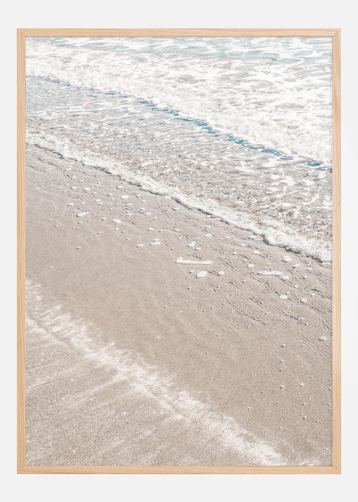 Este cartel relajante representa la belleza natural del límite de la playa donde el mar se encuentra con la tierra. La fina arena, marcada por las suaves olas del mar, crea una textura que es tanto sencilla como compleja. Los colores tranquilos de la arena se mezclan armoniosamente con la espuma blanca del mar y la línea turquesa clara donde rompe la ola, lo que ofrece una sensación de paz y claridad.