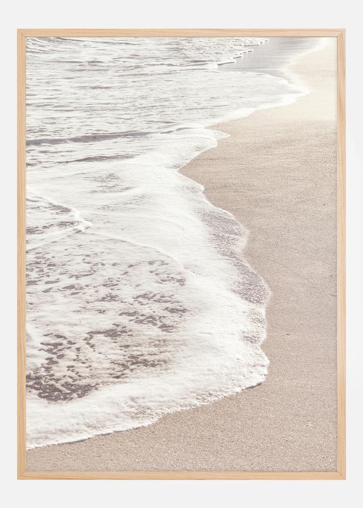 Este póster atmosférico retrata el tranquilo ritmo de las olas del mar que lentamente avanzan hacia la dorada playa de arena. La transición armoniosa del agua a la tierra captura el ciclo eterno del mar y la tranquila belleza del simple paisaje costero. Los colores suaves y neutros del póster y los delicados patrones de espuma sobre la arena transmiten una sensación de paz y una conexión atemporal con la naturaleza.