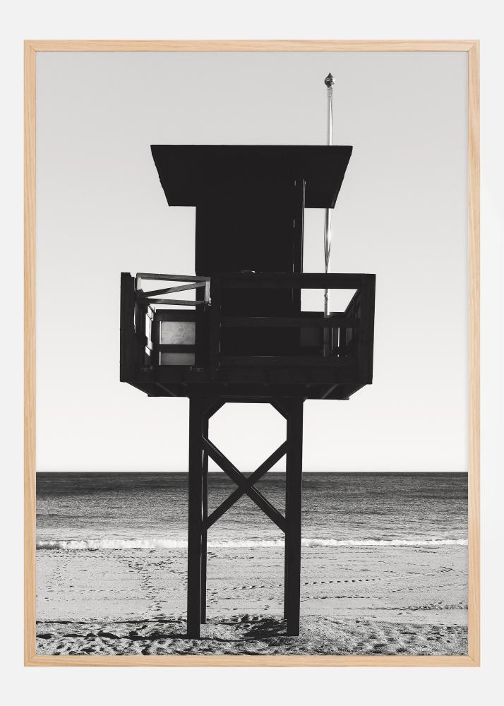 Este póster monocromático presenta una silueta icónica de una torre de vigilancia de playa contra un cielo despejado y un mar tranquilo. El fuerte contraste entre la torre oscura y los tonos claros de arena y cielo le da a la imagen una calidad gráfica que es tanto impactante como contemporánea. La imagen, tomada a la altura de los ojos, crea una sensación de presencia y calma, como si estuvieras de pie directamente en la playa mirando hacia el vasto mar.
