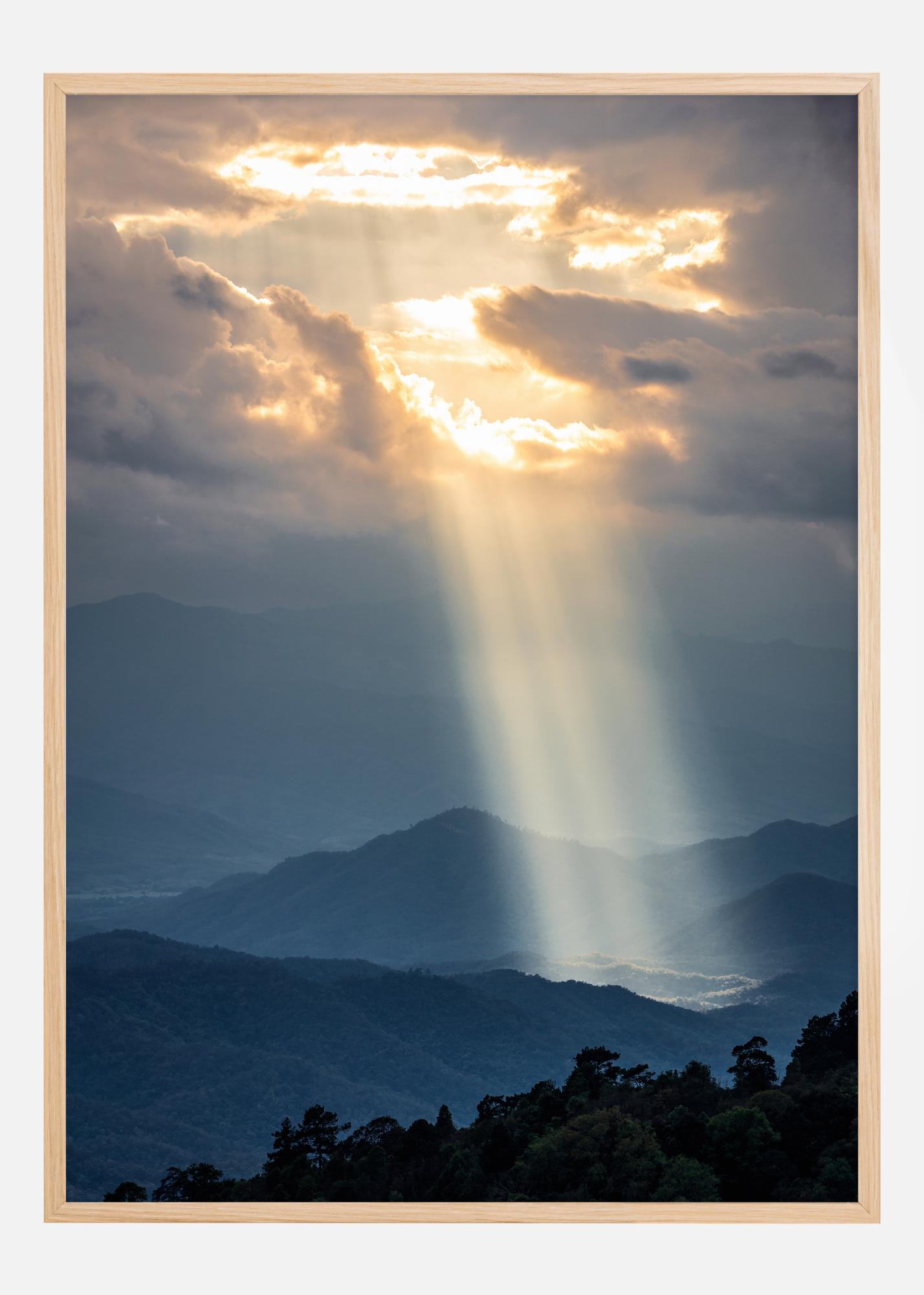 Este póster inspirador representa un majestuoso paisaje donde los rayos del sol se abren paso entre las nubes e iluminan las ondulantes montañas. Es una escena que captura la belleza sublime de la naturaleza, con un cielo dramático que contrasta con las montañas suavemente contorneadas. Sombras y luces juegan sobre el paisaje creando una fuerte sensación de profundidad y espacio.