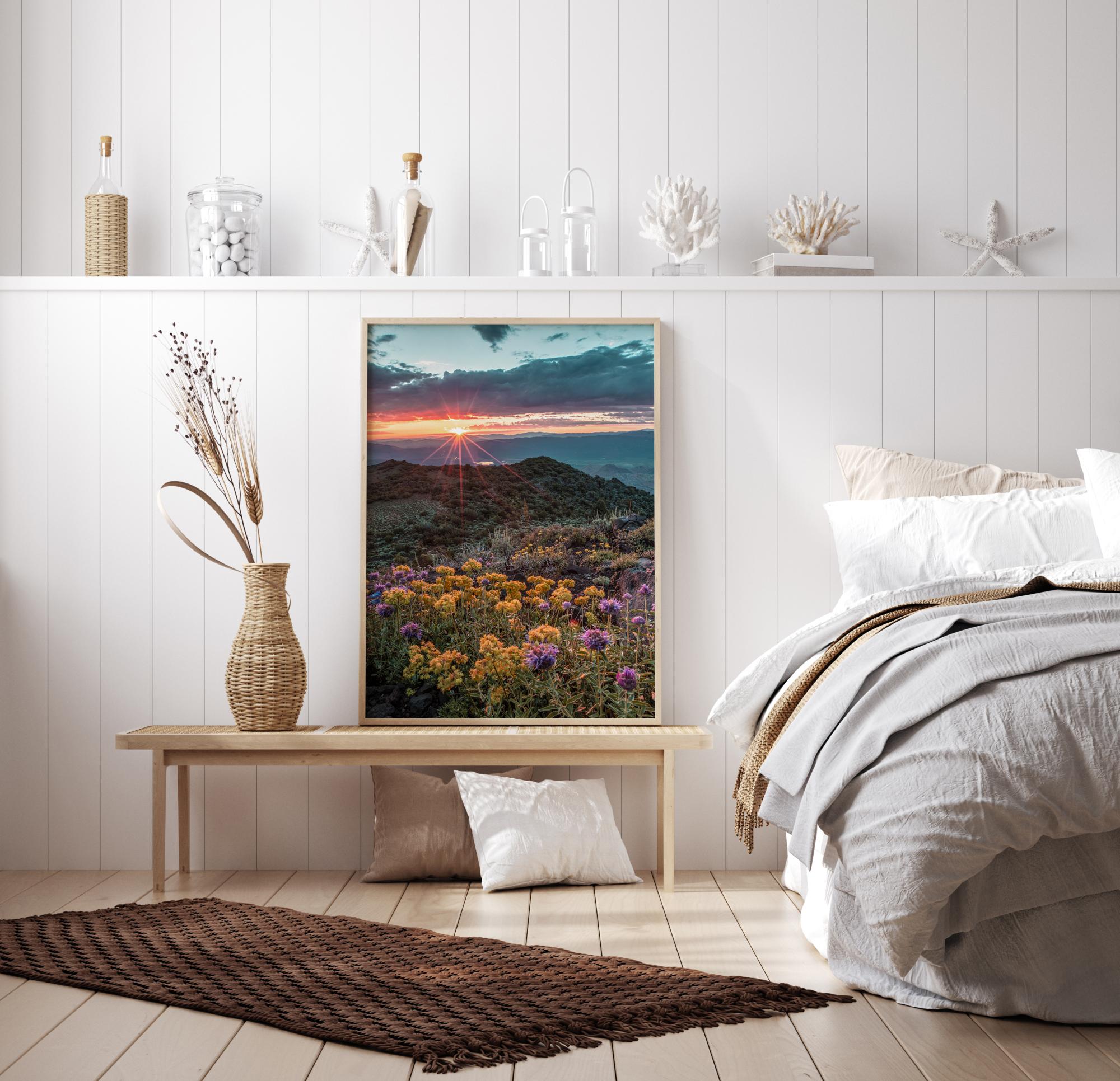 Un póster de naturaleza con flores silvestres en un lado de la montaña frente a una fantástico puesta de sol. Hermosas flores amarillas y moradas llenan la imagen, dirigiendo la mirada hacia las cimas de las montañas y el cielo oscurecido. La puesta de sol se ve como una estrella roja, lo que le da un punto focal destacado. Cuelga esta obra en tu pared para experimentar una parte de la naturaleza en casa.