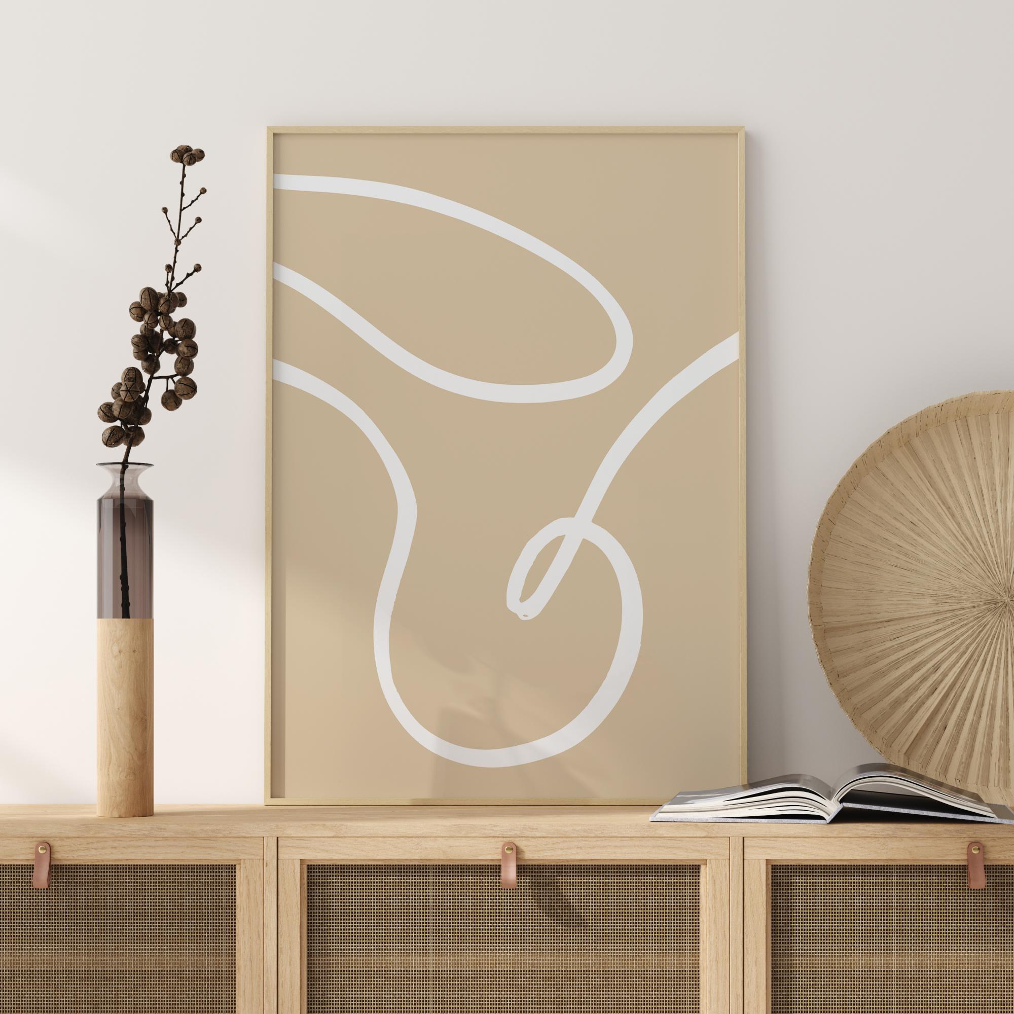 Un póster sencillo con un dibujo de líneas blancas crema que se ven como espirales sobre el fondo beige para dejar volar la imaginación. Puedes ver y experimentar lo que quieras mientras observas esta obra. Para un efecto aún más impactante, puedes colgar el póster en una pared de color audaz en tu hogar.
