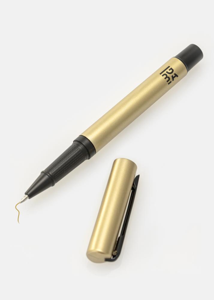Iniciar el selector de marcos »Bolígrafo de color dorado metálico que funciona excelente para usar en superficies brillantes como fotografías. El bolígrafo tiene un ancho de punta de 1 mm.