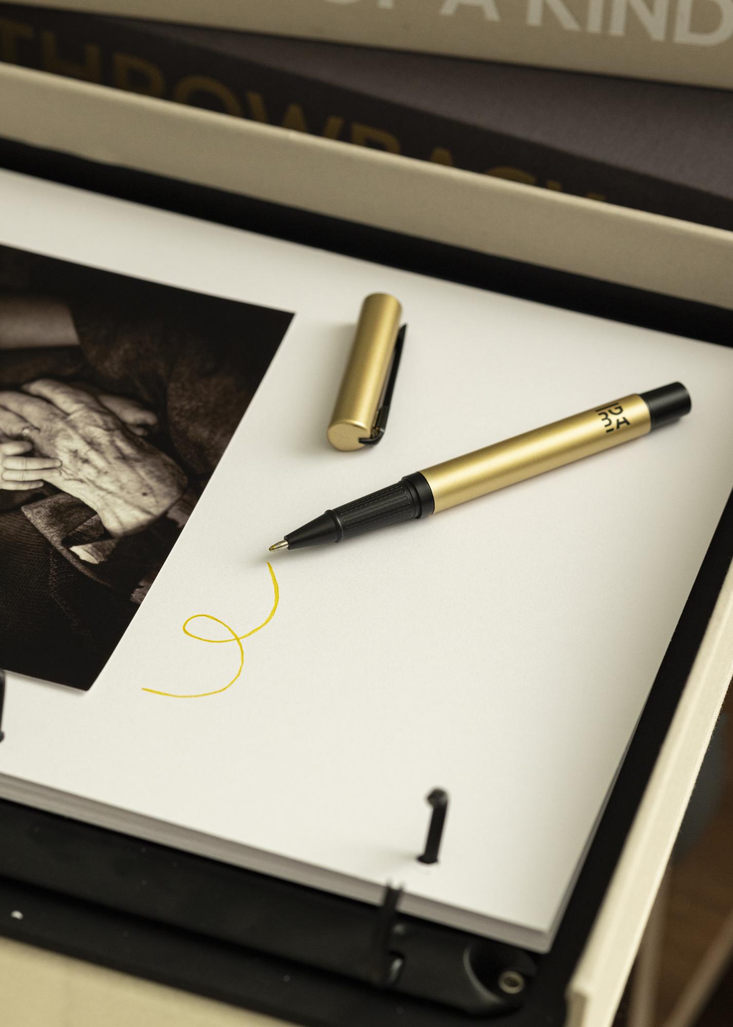 Bolígrafo de color dorado metálico que funciona excelente para usar en superficies brillantes como fotografías. El bolígrafo tiene un ancho de punta de 1 mm.