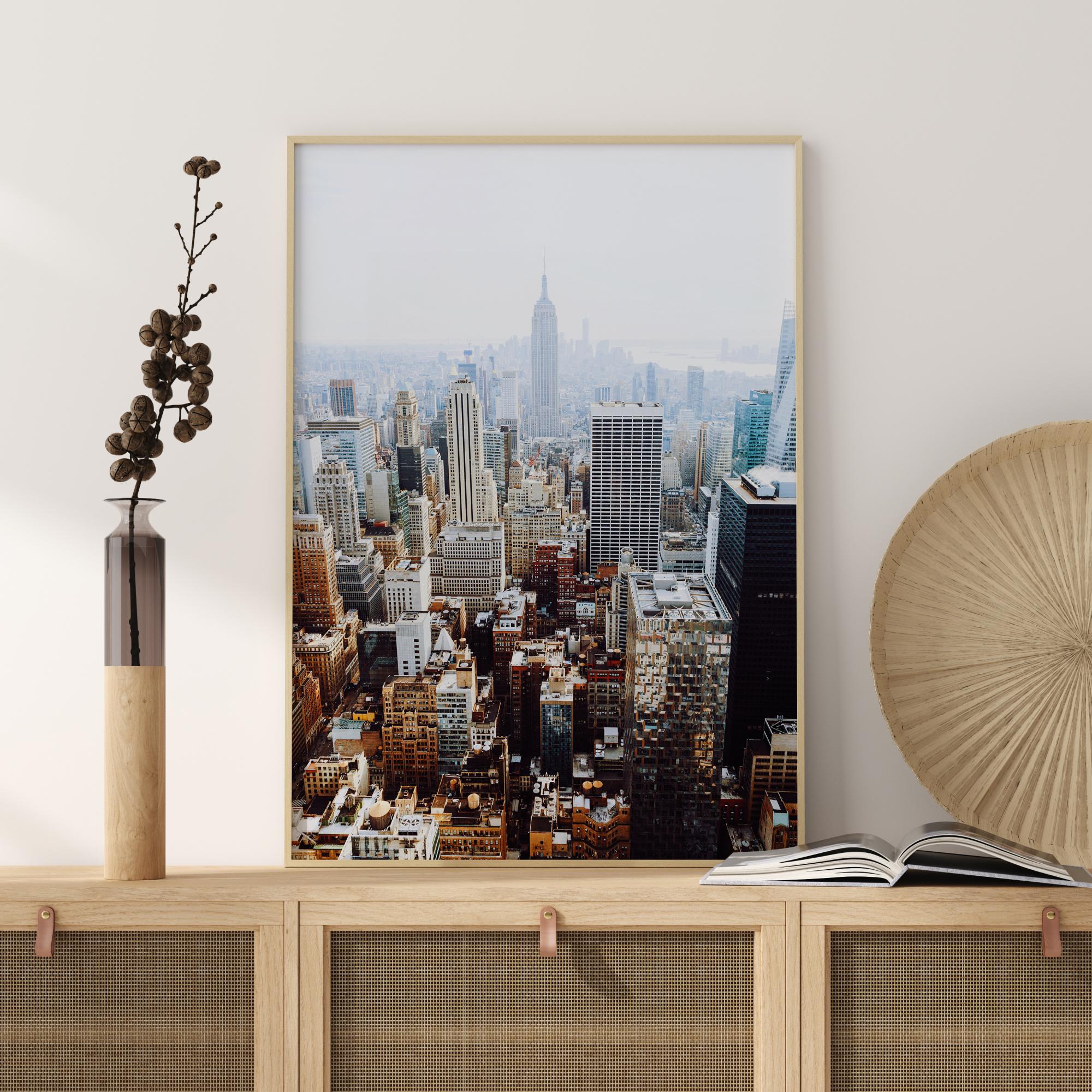 Un póster aéreo de la ciudad de Nueva York con el centro de la ciudad y el Empire State Building en la distancia. En primer plano, los colores comienzan como dorados y amarillos antes de mezclarse en el fondo en tonos más fríos de azul y gris. Es el enfoque disminuyendo de la imagen lo que crea la profundidad. Llévate esta obra a casa y disfruta de una expresión artística de la vida urbana.