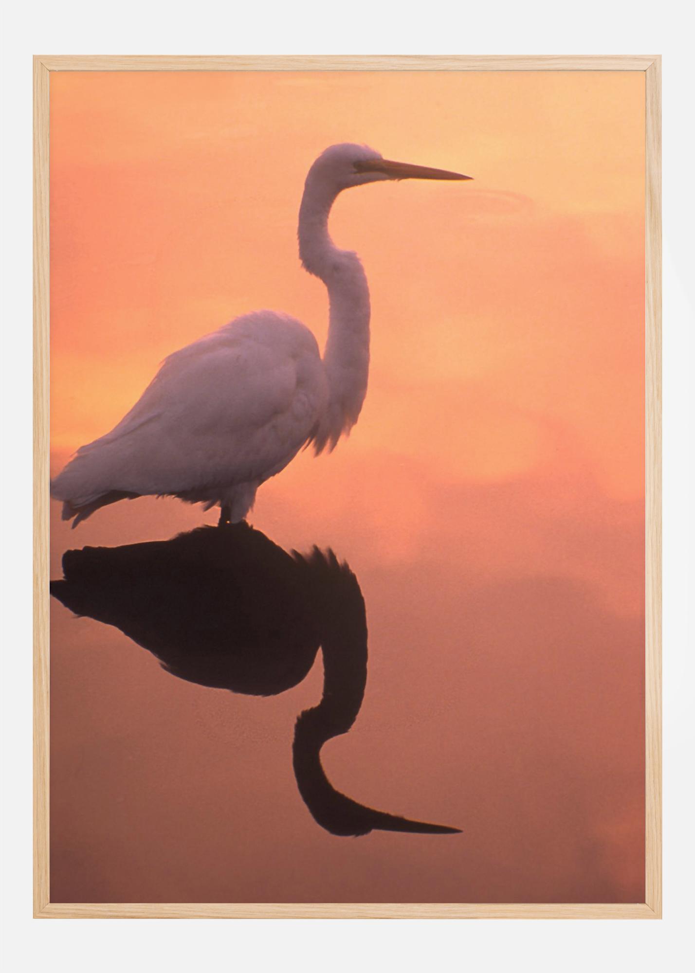 Un póster de la naturaleza salvaje con una cigüeña blanca frente a un cielo naranja fascinante. La sencillo reflexión de la cigüeña en el agua también refleja el cielo. Los suaves colores naranja y amarillo son perfectos para brindar calidez y tranquilidad al hogar.