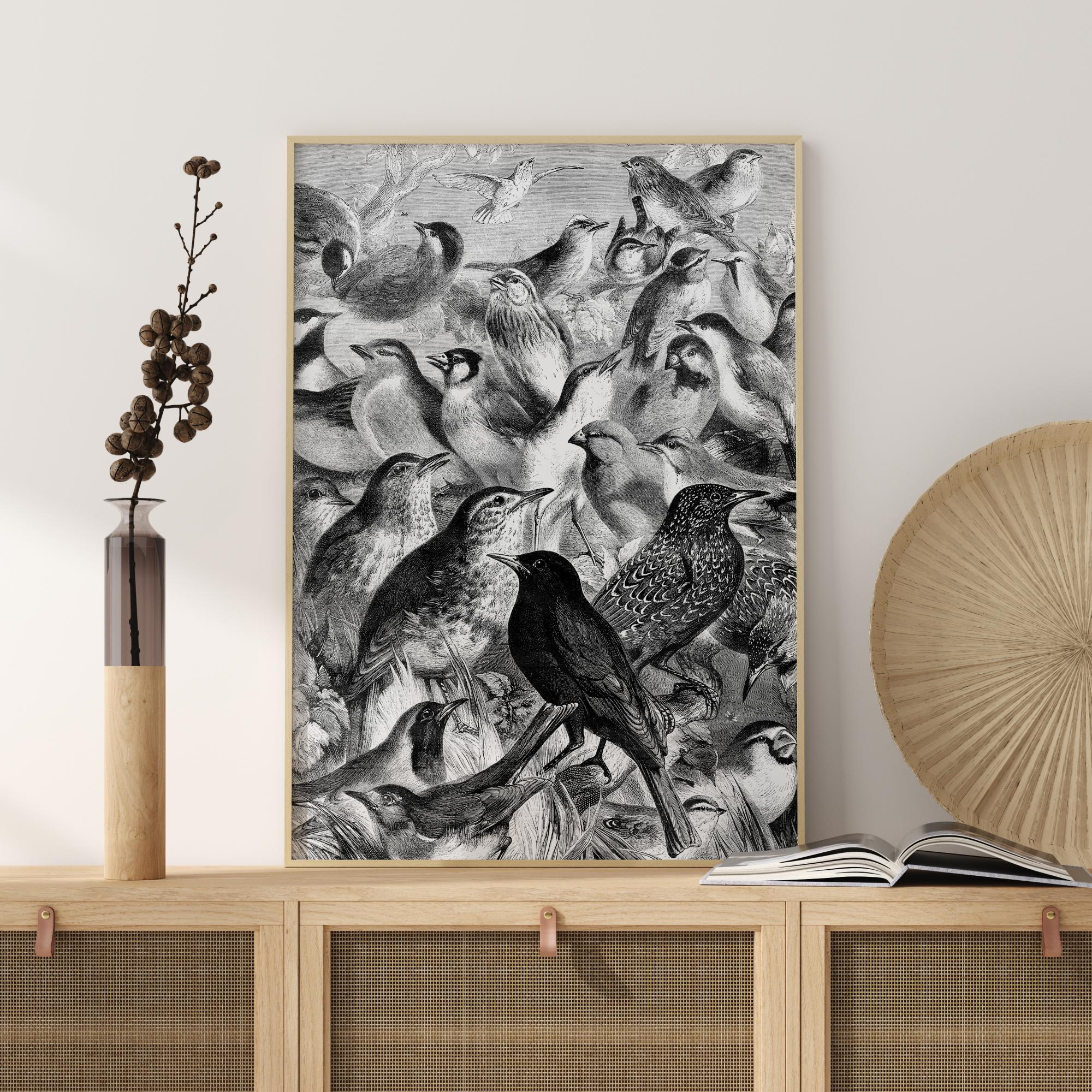 Un póster en blanco y negro con diferentes pájaros. Aprende todo sobre los pájaros con la ayuda de esta impresión con diferentes pájaros británicos. Mantente ocupado mientras descubres los pájaros en la imagen y aprendes algo sobre ellos. Permíteles destacar aún más colgando la imagen en una pared de color claro.