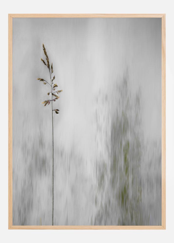 Un póster suave con una sola espiga de hierba contra un fondo gris suave. La espiga dorada se destaca claramente contra un enfoque suave en el fondo que captura la atención. Cuelga la imagen en una pared neutral en casa para darle un toque de magia con esta obra sencilla.