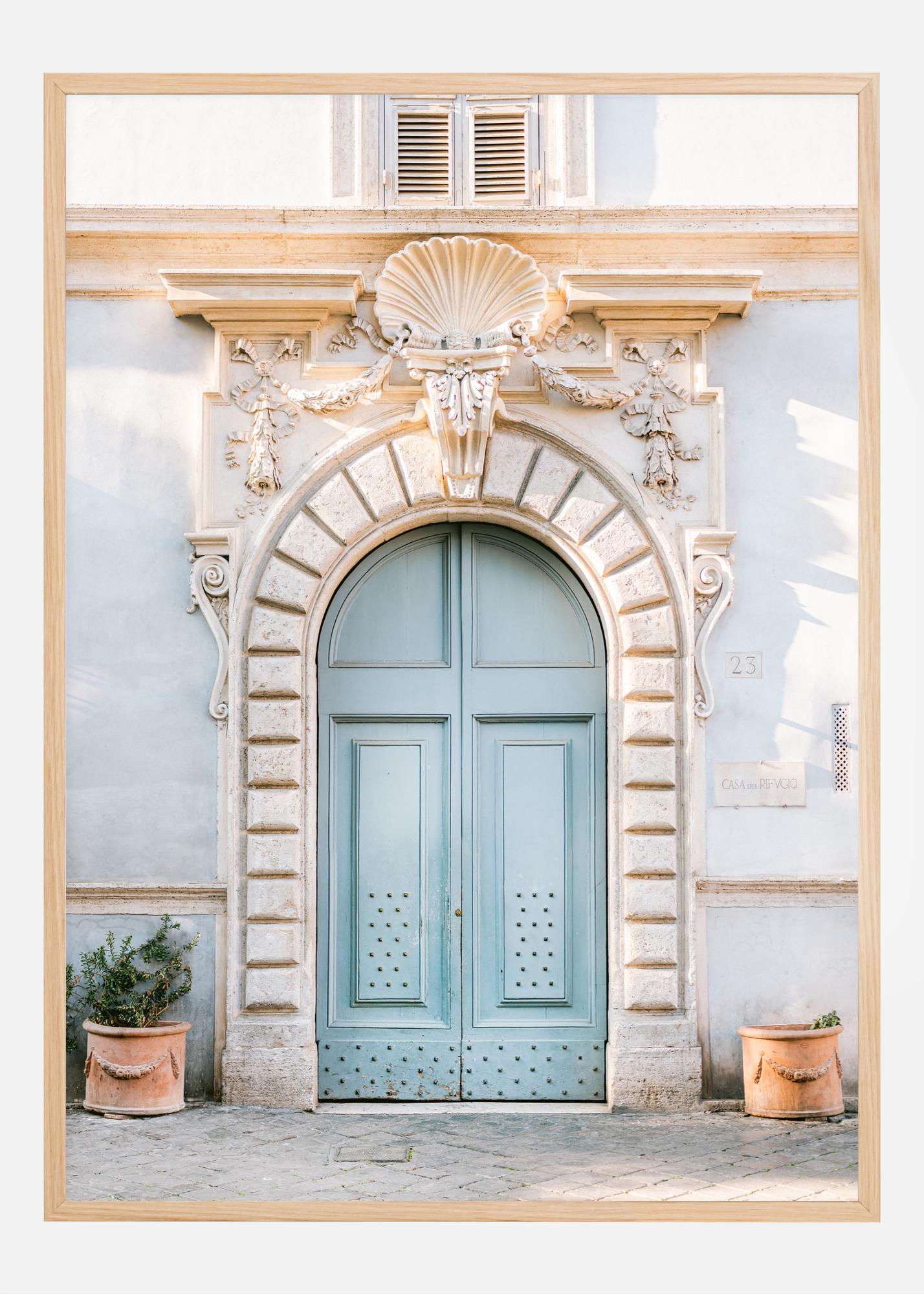 Este póster captura la belleza y el encanto de una arquitectura europea clásica. La puerta doble de color azul claro está rodeada por un elegante portal de piedra, con finos detalles esculpidos y ornamentaciones que brindan una sensación de riqueza histórica y herencia cultural. Sobre la puerta se encuentra un impresionante arco en forma de concha que completa esta majestuosa entrada. A cada lado de la puerta se encuentran macetas con plantas verdes, lo que añade un contraste natural y vivo a la fachada de piedra. Esta imagen irradia una atmósfera tranquila y elevada, perfecta para añadir un toque de belleza clásica a cualquier hogar.