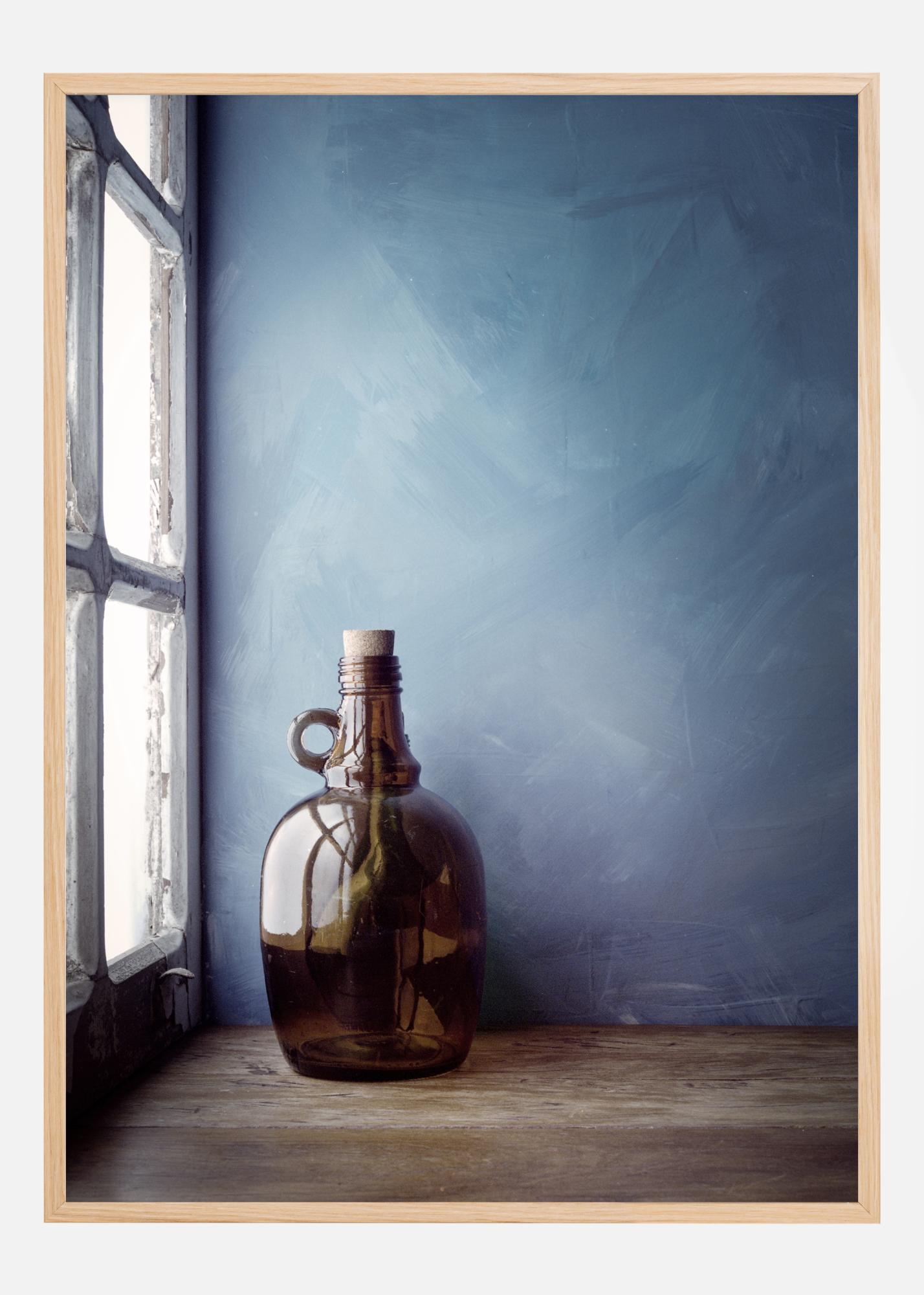 Un póster de bodegón (bodegón (naturaleza muerta)) con una botella marrón contra una pared azul. La luz de una ventana entra desde la izquierda iluminando la botella y creando reflejos. Añade una sensación rústica a tu hogar con la suave pared azul y la antigua mesa de madera donde se encuentra la botella.