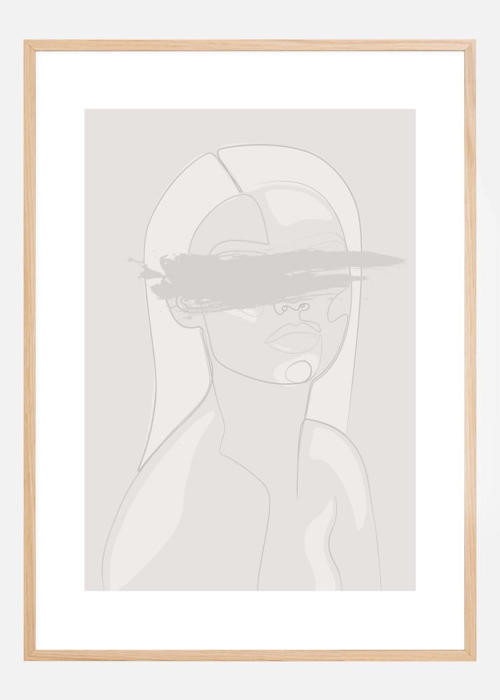 Un póster abstracto con una mujer con los ojos cubiertos. Esta imagen tenue en blanco y gris muestra la cabeza y los hombros de una mujer en formas de bloques y líneas. Un toque de color cubre los ojos, creando misterio alrededor de la mujer. Un fuerte borde blanco la enmarca, perfecto para colgar en una pared de color audaz en el hogar.